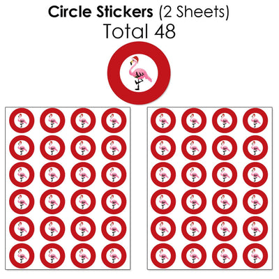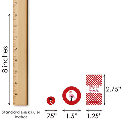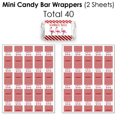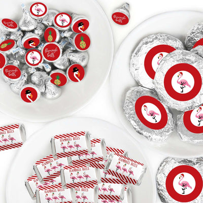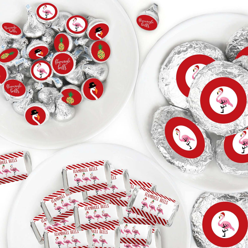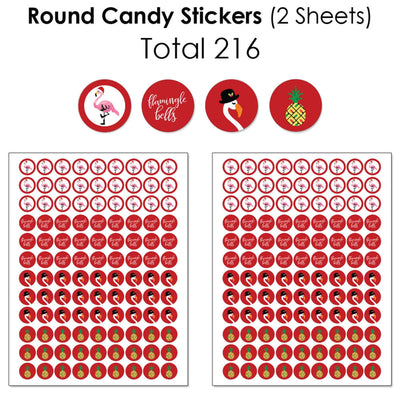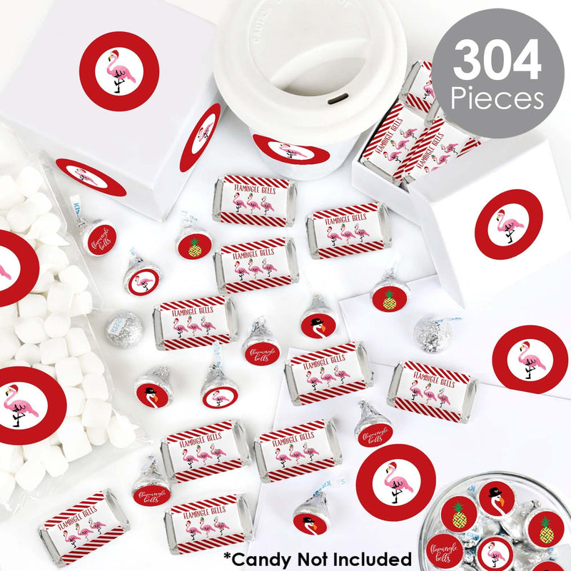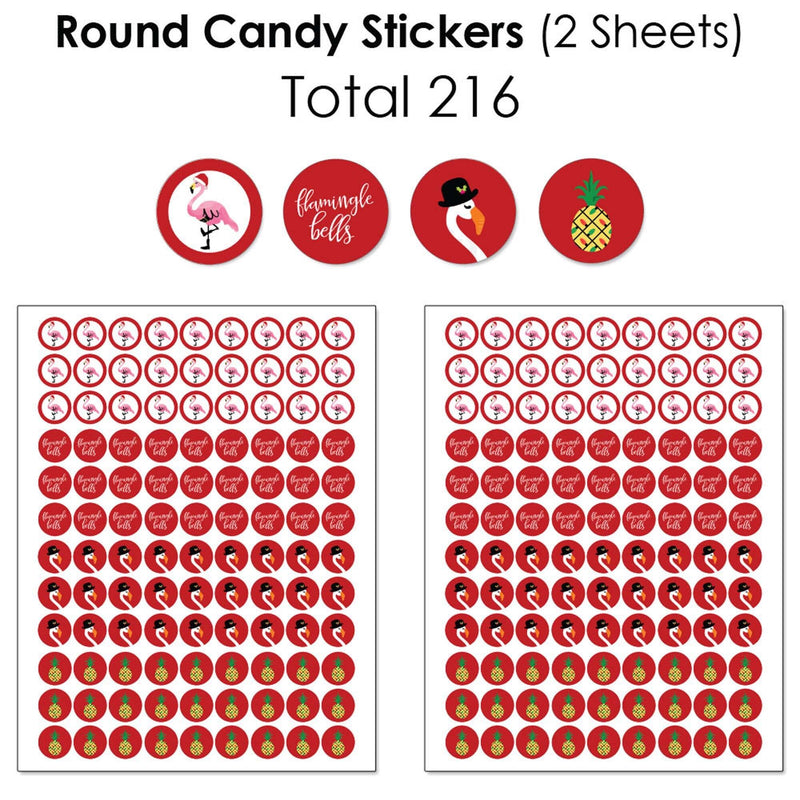 Wow your party guests when you coordinate the candy buffet and favors to your Tropical Christmas Party theme with Flamingle Bells Favor Kit: Candy Stickers. This 304 - piece kit includes Mini Candy Bar Wrappers, Round Candy Stickers, and Circle Stickers. Easy assembly with peel and stick stickers, no tape needed. Simply center and press onto your favorite candies. Flamingle Bells candy favor sticker kit is a fun way to add a unique touch to all areas of your party. Be creative with this DIY decoration and use for treats, centerpieces, place settings, favors, and more!