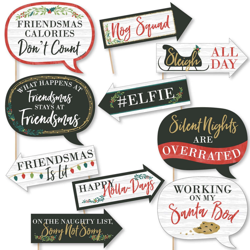 The perfect photo booth begins with fabulous photo booth props. Our printed and cut kit will help you easily create fun party photos at your Friends Christmas Party. This Funny Rustic Merry Friendsmas prop kit comes with 10 pieces and is ready for quick assembly. Simply add the included prop kit sticks to each piece, attaching with the included clear stickers, and display alongside a fun photo booth backdrop. Your friends and family will love the fun photos they will create with this amazing 10 piece Funny Rustic Merry Friendsmas Photo Booth Prop Kit.