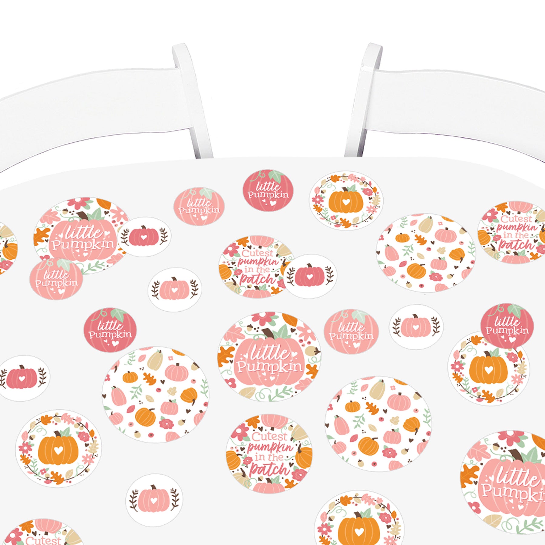 This Kit Includes 27 Confetti Pieces: 6 -5.5" party circles with Girl Little Pumpkin art 9 -4.25" party circles with Girl Little Pumpkin art 12 -2.75" party circles with Girl Little Pumpkin art
