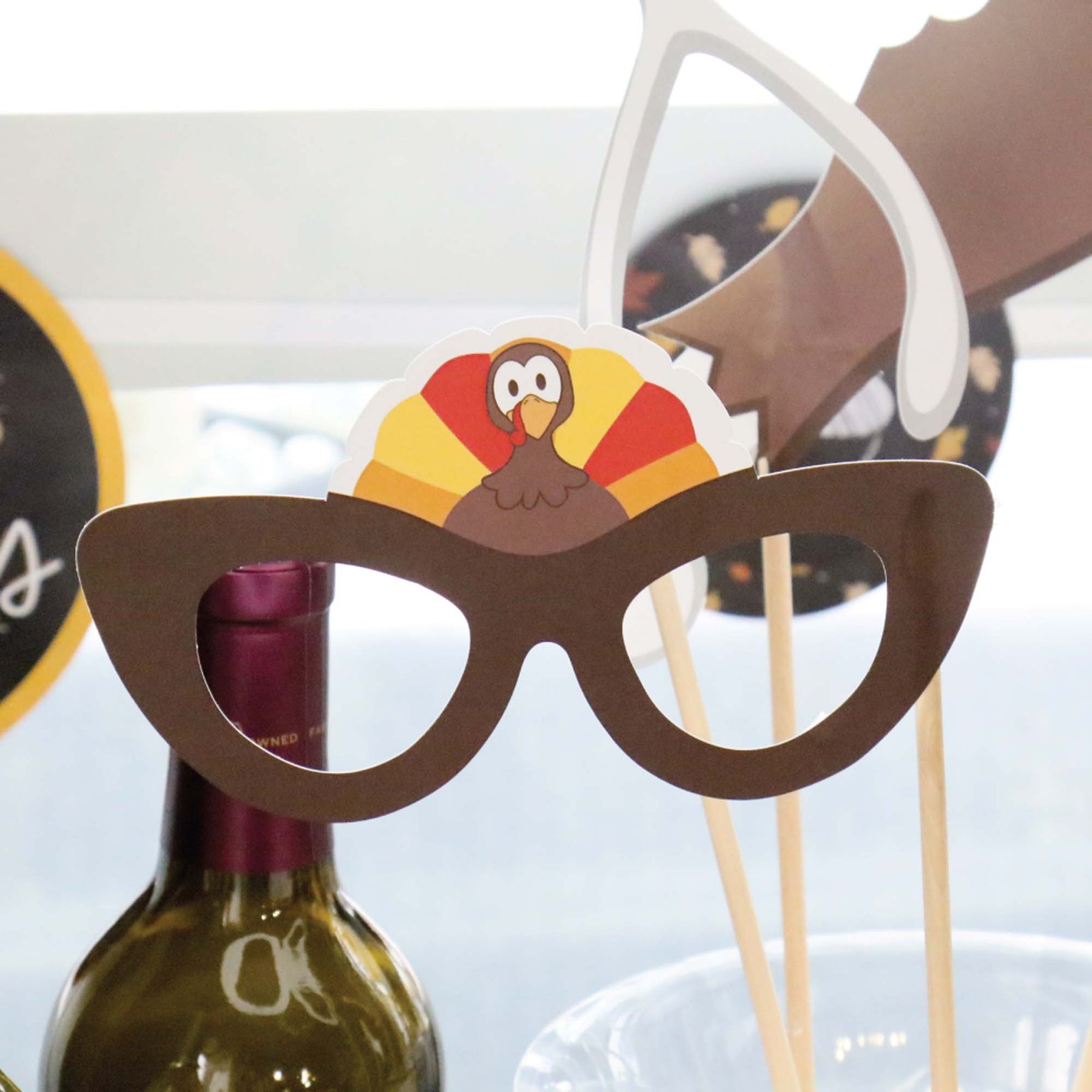 The perfect Thanksgiving photo booth begins with fabulous photo booth props. Our printed and cut kit will help you easily create fun party photos at your Thanksgiving party. This Give Thanks - Thanksgiving photo booth props kit comes with 20 pieces and ready for quick assembly. Simply add the included prop kit sticks to each prop, attaching with the included clear stickers, and display alongside a fun photo booth backdrop. Your Thanksgiving party guests will love the mustaches, bow ties, lips, glasses, hats and talk bubbles!