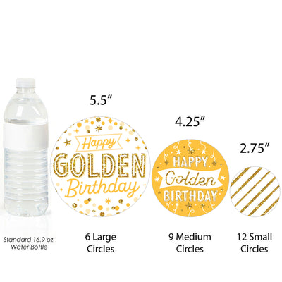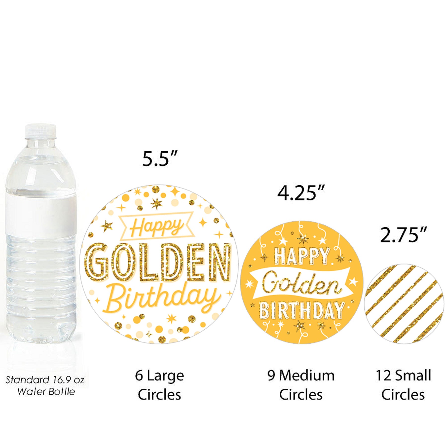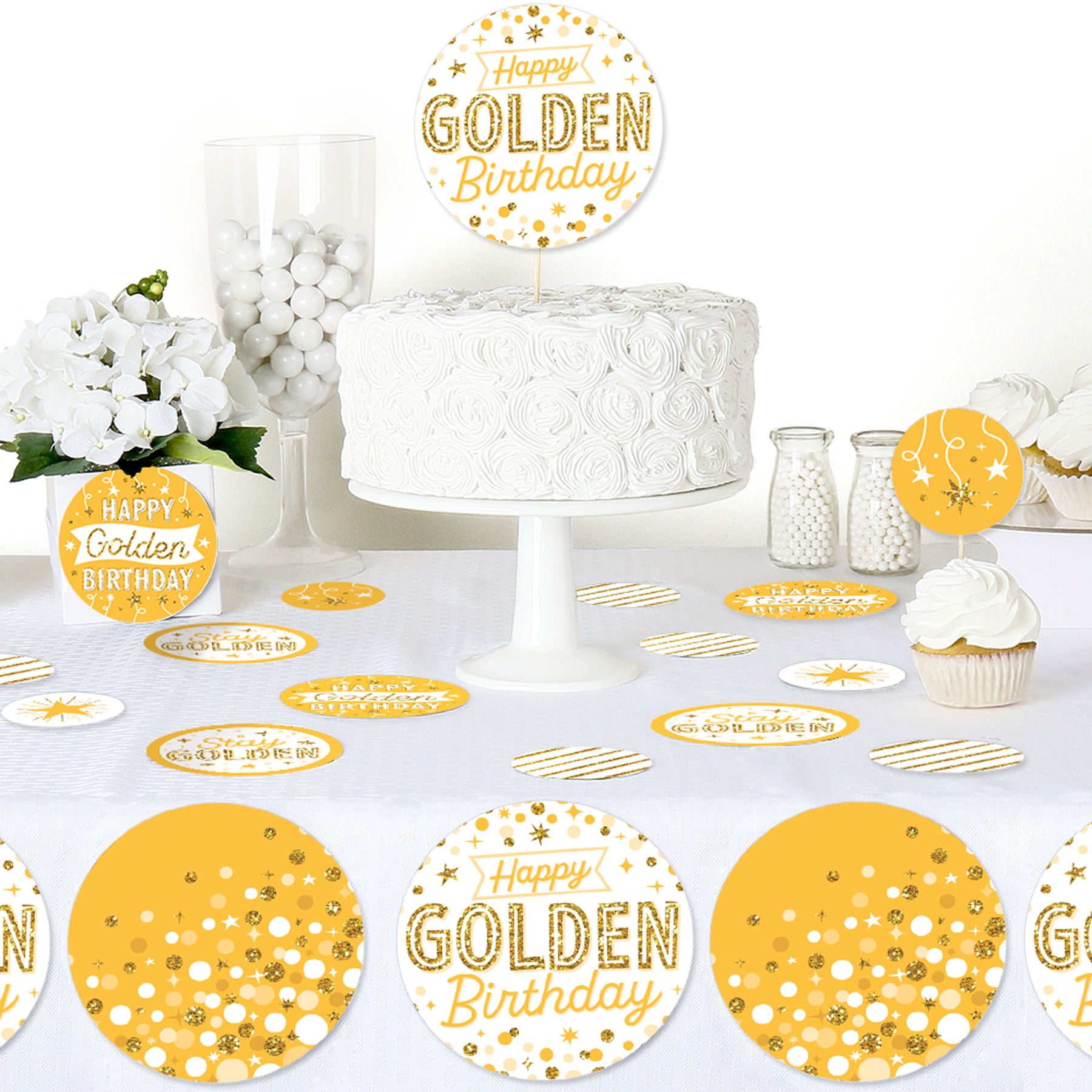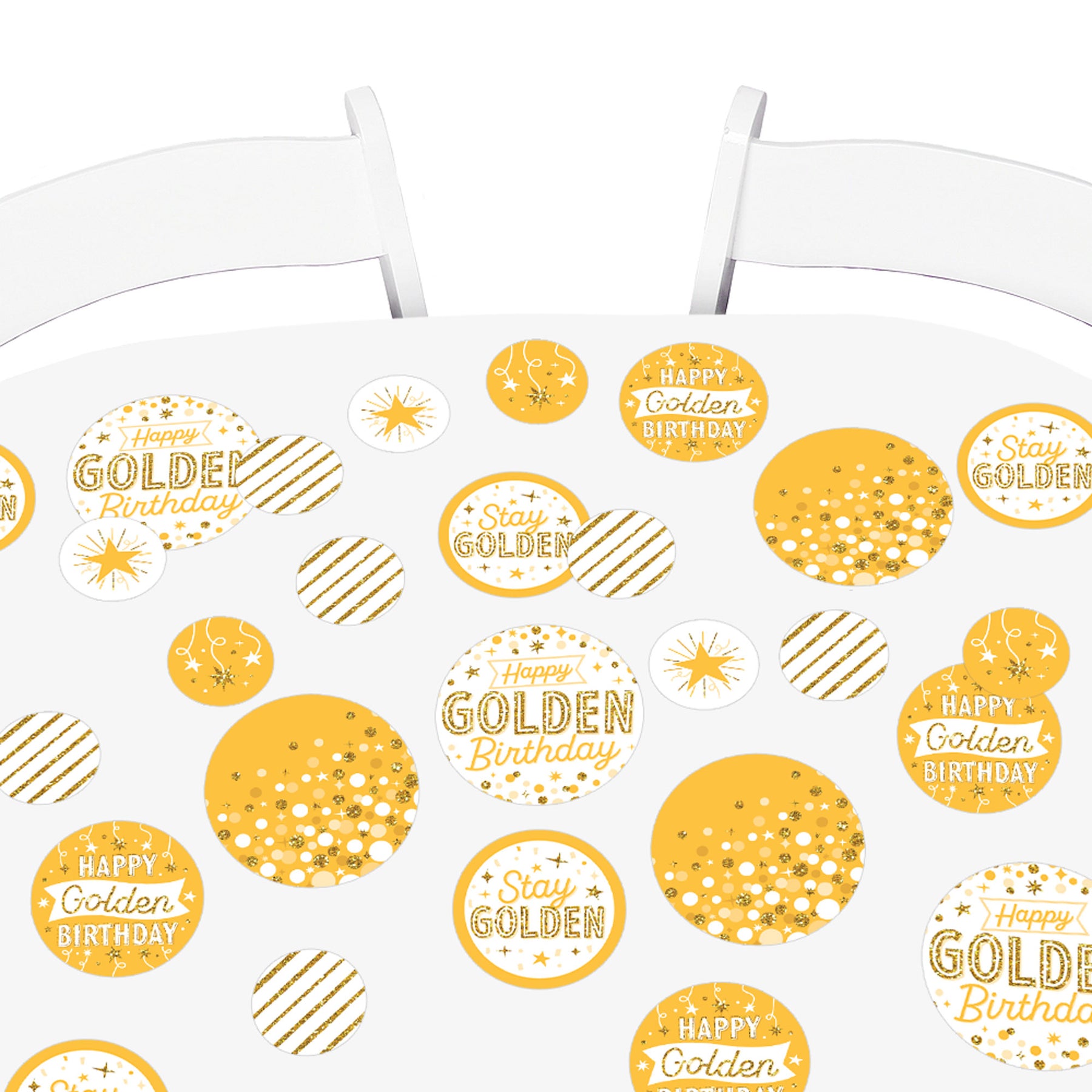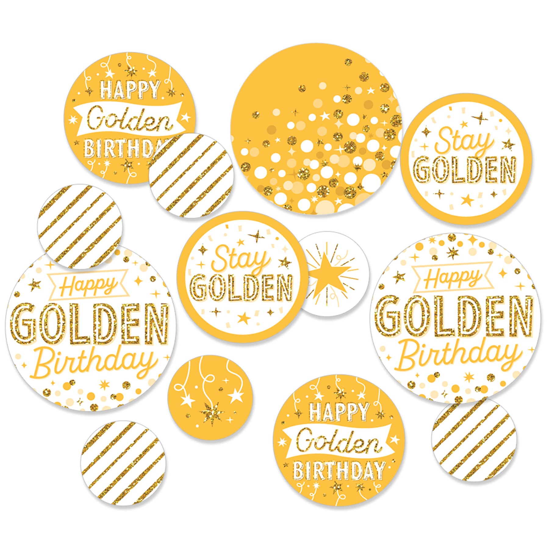 This Kit Includes 27 Confetti Pieces: 6 - 5.5" party circles with “Happy Golden Birthday” art 9 - 4.25" party circles with “Happy Golden Birthday” art 12 - 2.75" party circles with Golden Birthday themed art