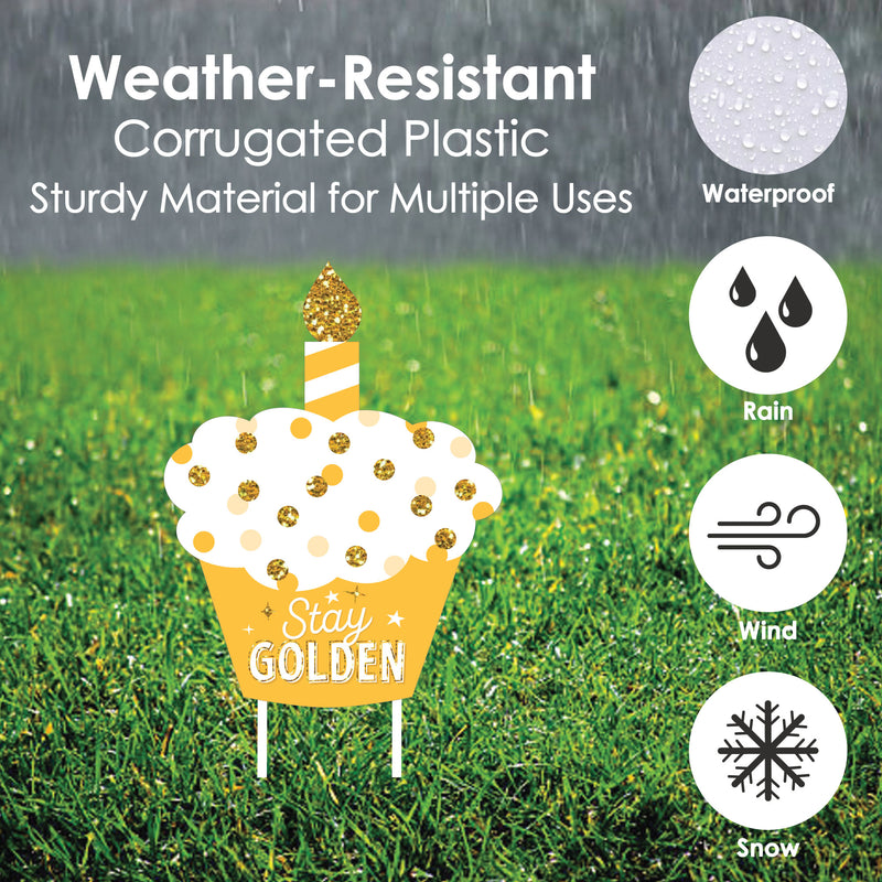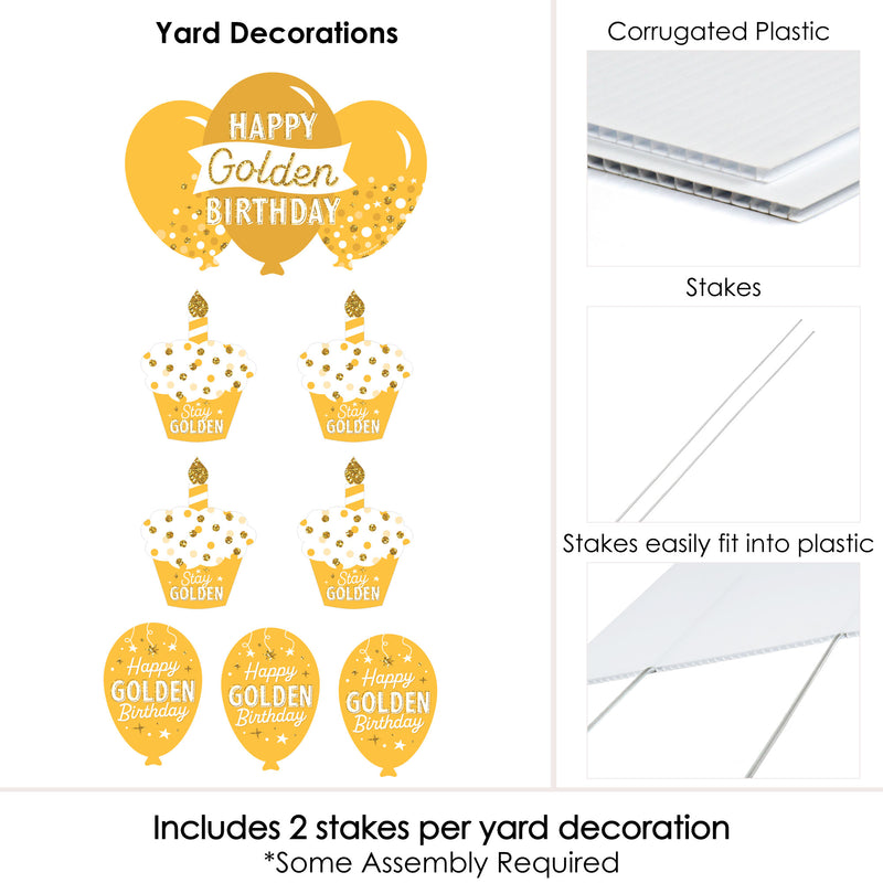 An impressive Golden Birthday yard sign is sure to delight your guests and surprise everyone. This 8-piece set of Golden Birthday lawn decorations is professionally printed with vivid colors to really make a statement wherever it is used. Each outdoor shape comes with two stakes, making it easy to display on lawns, driveways or courtyards. Best of all, Golden Birthday shapes are cut separately so you can arrange them any way you please. These decorative yard signs are made of waterproof plastic and are weather resistant, perfect for short-term display but can be used again and again with proper care.