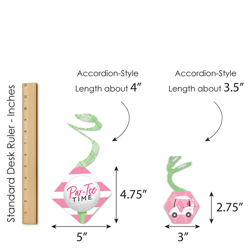 Take your Pink Baby Shower or Birthday Party to the next level when you add Golf Girl Party Decoration Swirls. Professionally printed and double-sided on heavy-duty cardstock paper, this set of 40 swirls (10 count per shape) all hang below accordion-style spirals with included clear hooks. Each decoration swirl in the 40-piece hanging decor set has a pre-cut hole for easy assembly using the included clear hooks. Party Decoration Swirls will arrive flat. Take a clear hook and insert the bottom bar into the pre-cut hole. Once the clear hook is fastened, gently stretch the swirl and hang it up. Add a pop of color when displayed over the gift table or dessert buffet. Or, add your own string if you would like them to hang lower in your party space.