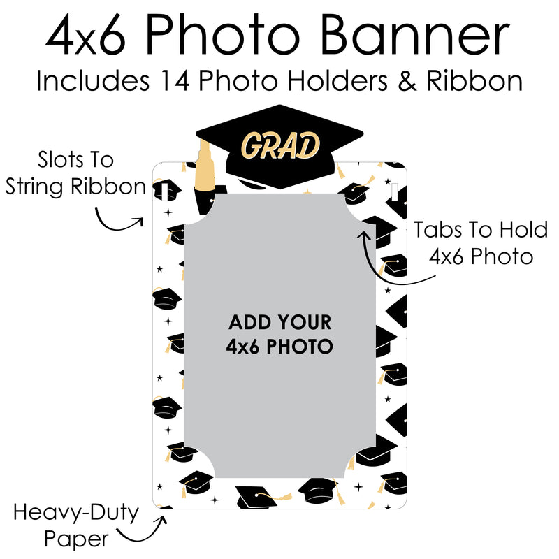 Start by inserting your vertical 4x6 photo into the pre-cut corner tabs of each photo holder. Following the number sequence on the back of each photo holder, simply string the included satin ribbon through the slots. Create multiple rows by cutting the ribbon to your desired length or hang as one long banner. This Photo Banner will look great in all areas of your graduation party venue. Hang the Photo Banner at the front of the buffet table or behind the dessert table. It will also be great at the entrance to greet guests or above the guest of honor’s seat for a fun photo op.