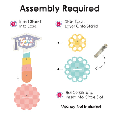 Wow the guest of honor when you present them with an Groovy Grad Cash Cake at their Hippie Graduation Party! A fun and creative way to gift money, this DIY grad cap cash holder stand kit comes in a 2-tier cake shape when put together and will have 20 slots, size 0.5” in diameter, that can hold your rolled money. To assemble, simply attach the centerpiece stand through the base piece and fold the half-circle ends at the bottom in opposite directions. Secure them into place using adhesive dots. Then, slide your layers onto the stand and add your rolled-up bills into the circle slots. For a special touch, add in some rolled-up advice notes or write a personalized message on the backside of the stand. The pastel rainbow grad cash holder is an impressive gift and table party decoration statement piece that will delight your graduate and partygoers with its eye-catching display. They will appreciate receiving a practical and meaningful gift and enjoy the flexibility of using the cash gift however they choose. Surprise your recipient when you gift them with the Groovy Grad Cash Cake.