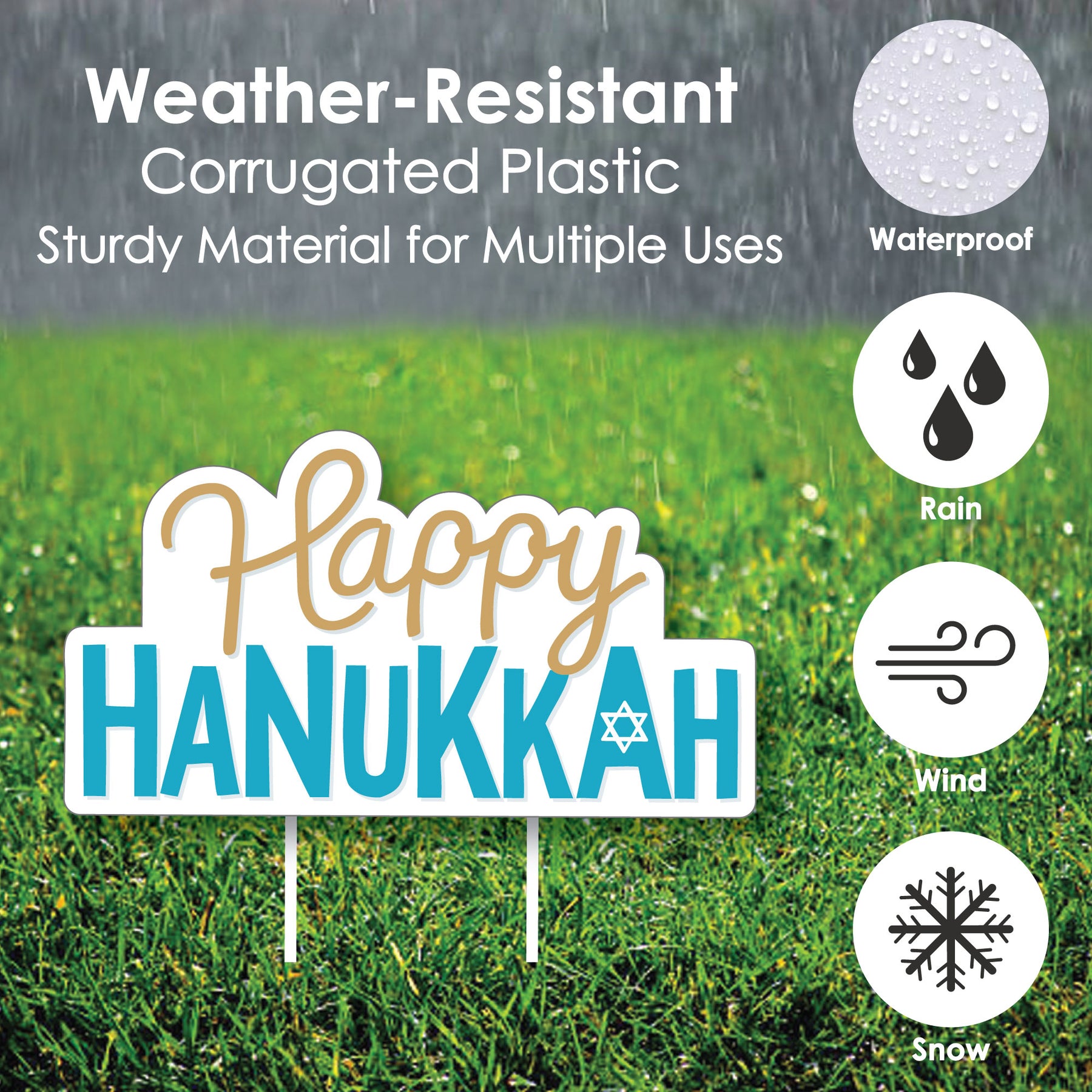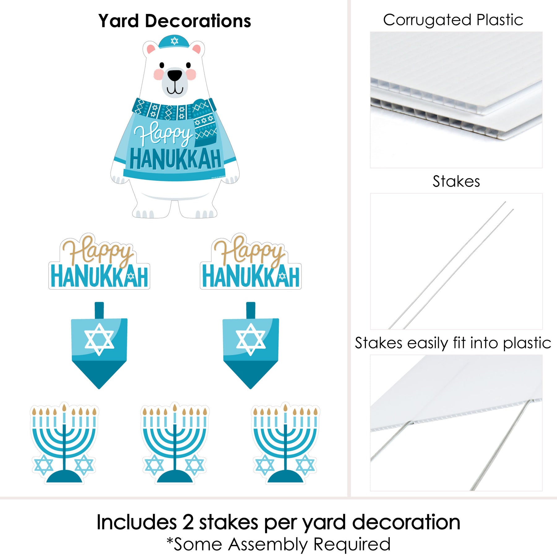 An impressive Hanukkah Bear yard sign is sure to delight your guests and surprise everyone. This 8-piece set of Hanukkah Bear lawn decorations is professionally printed with vivid colors to really make a statement wherever it is used. Each outdoor shape comes with two stakes, making it easy to display on lawns, driveways or courtyards. Best of all, Chanukah Holiday Sweater Party shapes are cut separately so you can arrange them any way you please. These decorative yard signs are made of waterproof plastic and are weather resistant, perfect for short-term display but can be used again and again with proper care.