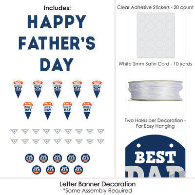 Greet your party guests and the Guest of Honor with an impressive Father's Day Party banner. Happy Father's Day Letter Banner Decoration is an eye-catching way to decorate for any Father's Day Party. The variety of pennant designs and shapes paired with the Happy Father's Day script letters will look great at any venue. Simply string the letters onto the included cording and then add the pennant shapes in any order you wish. Hang as one large banner or cut into different lengths and display in multiple rows. Letter banner decorations are an easy-to-use party supply for your celebration.