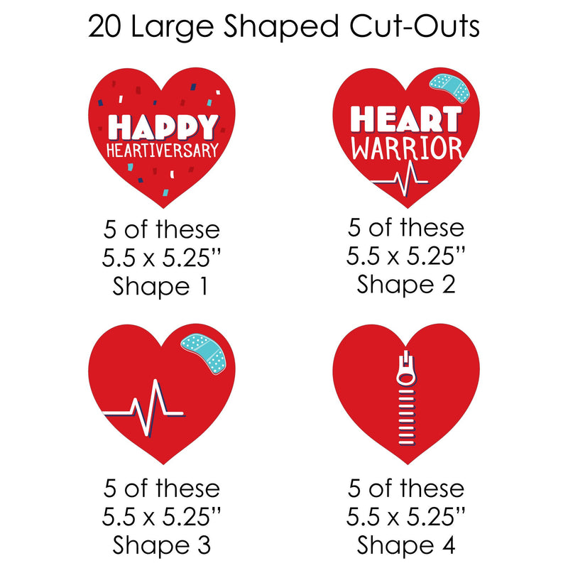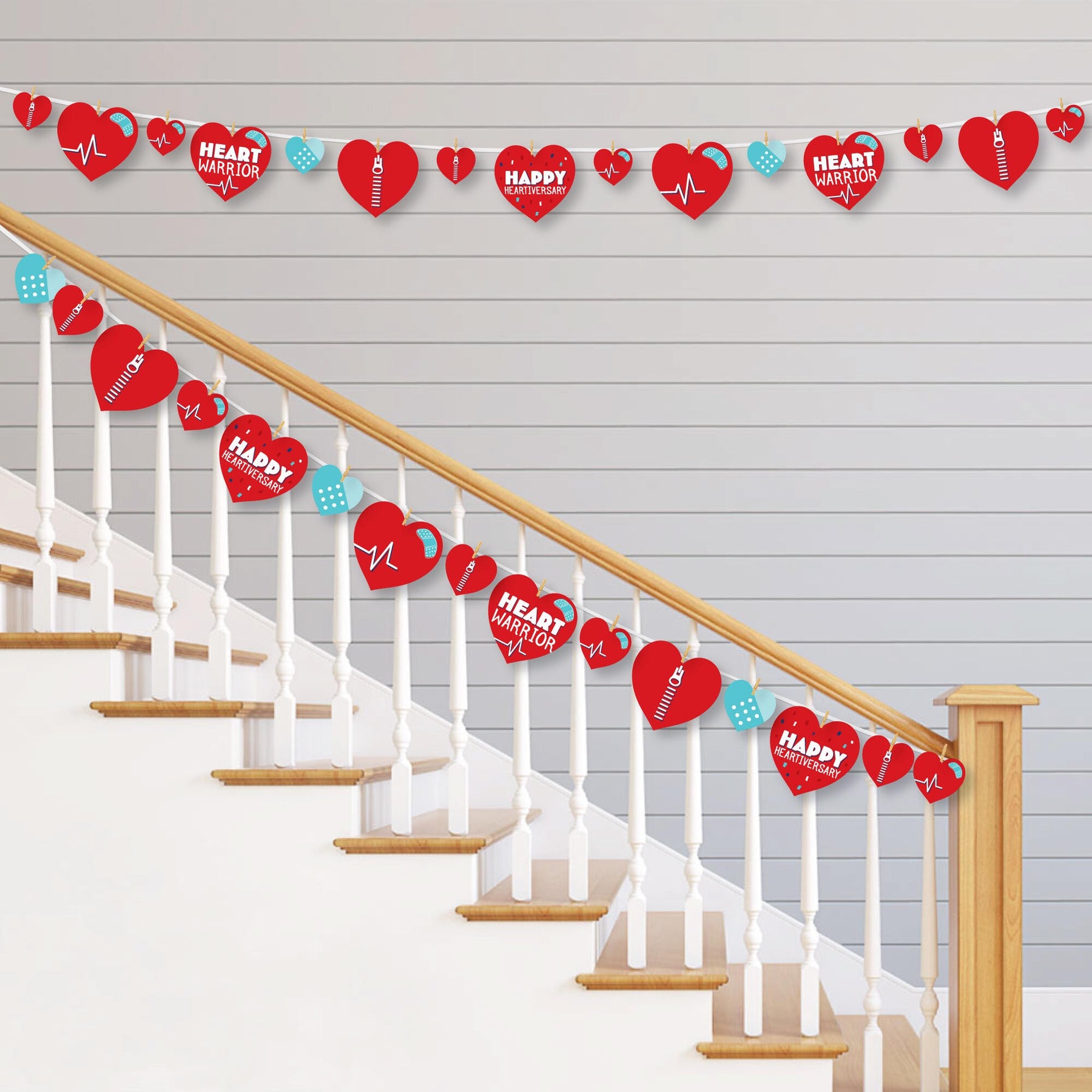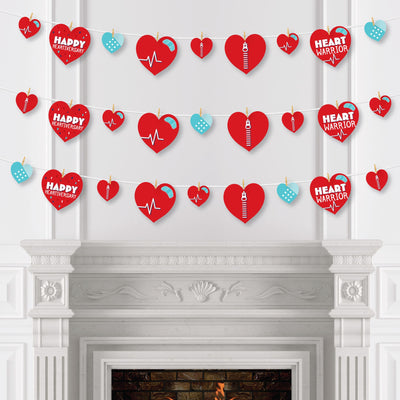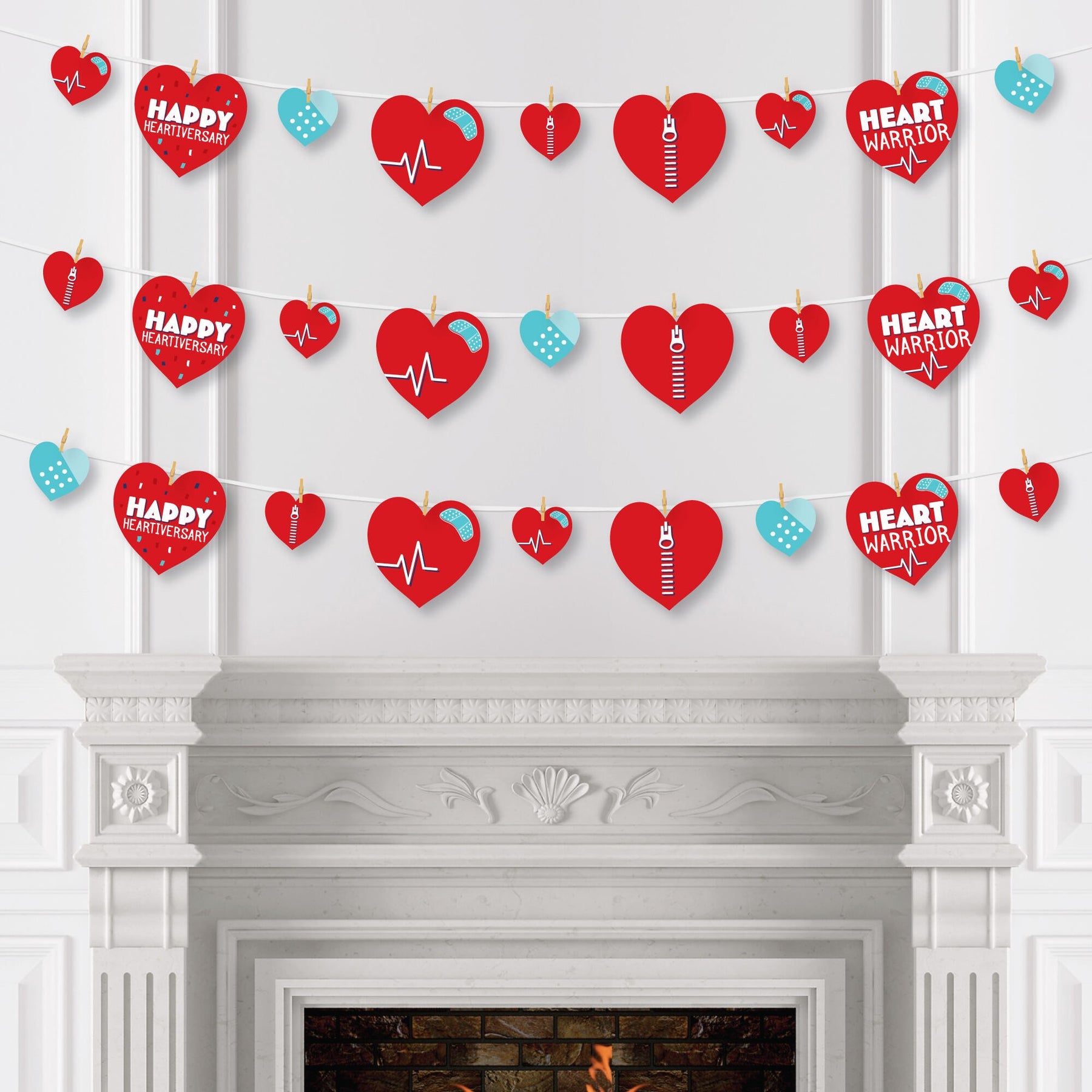 Easily decorate your CHD Awareness event with Happy Heartiversary clothespin garland banner. This DIY banner kit includes 44-pieces of Happy Heartiversary paper cut-outs, 50 mini clothespins, and white cord. Before hanging, plan out your desired pattern by alternating in sizes. Using a miniature clothespin, clip shapes on the included cord. Hang finished DIY garland banner at the entrance of your party, over mantelpiece, along buffet tables, or as high chair banner decoration. After the party, reuse the clothespins and cord to hang event photos as a fun keepsake. Happy Heartiversary large cut-outs are professionally printed double-sided, small cut-outs are professionally printed with coordinating pattern on back, and all on sturdy cardstock paper with a photo-like shine.