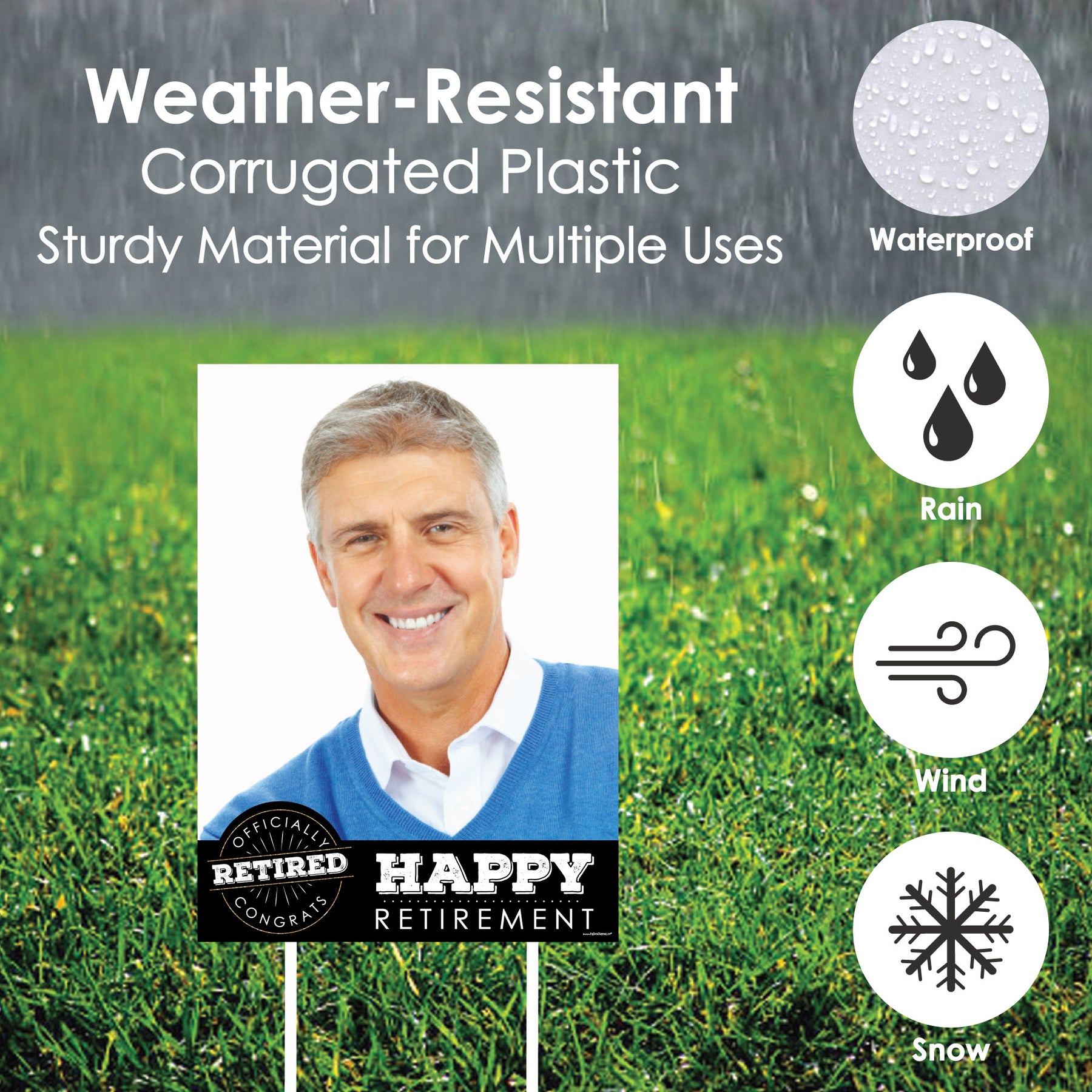 Celebrate the guest of honor with a custom photo yard sign that is sure to impress. Your party guests will love seeing this outdoor retirement party decoration as they arrive at your celebration. This reusable party sign is waterproof, making it perfect for any outdoor space. Displaying the guest of honor's photo sign is easy - simply insert the included stakes into the plastic yard sign and then into the lawn or courtyard to let everyone know where the party is. This decorative yard sign is perfect for short-term display but can be used again and again with proper care.