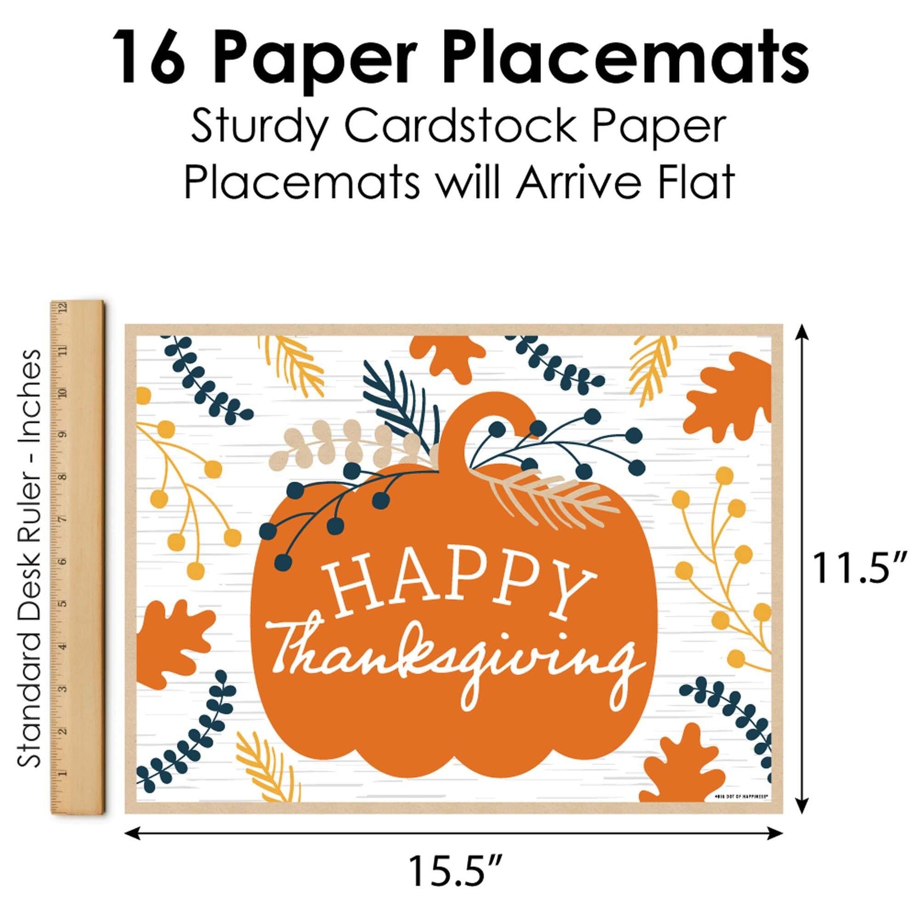This set of 16 paper placemats are the perfect party table decoration for any party. Use placemats to decorate tables for at-home dinner parties or take to your favorite restaurant and place at each setting. Made of sturdy cardstock paper, these disposable Happy Thanksgiving placemats will make it easy to clean up after the party is over.