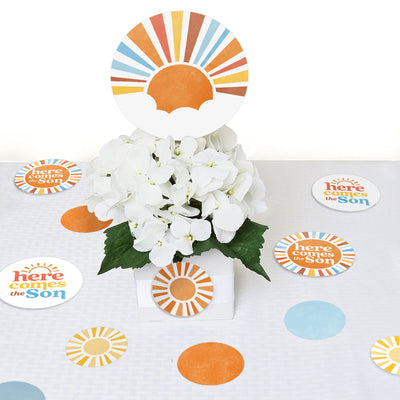 These extra-large sun-themed confetti pieces are perfect for your Here Comes The Son baby shower! Use them to scatter across tables, create garland banners, or make adorable themed tags for crafts and favors with a hole punch and ribbon.