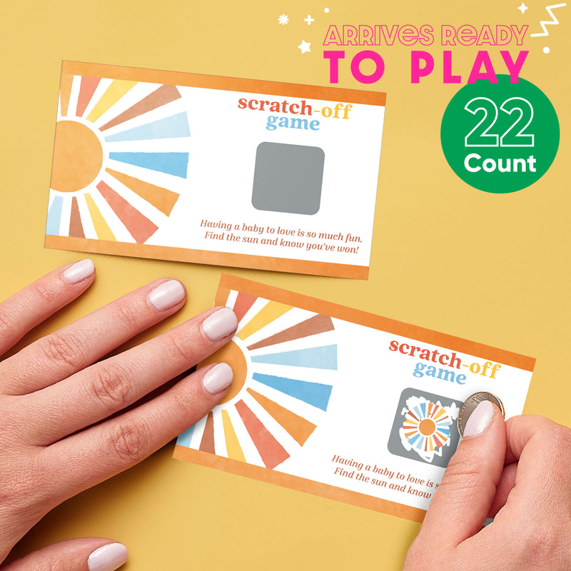 Everyone will love to play this little sunshine Baby Shower game! Our Here Comes The Son scratch off cards makes giving out door prizes a breeze and guests love scratching them to see what is underneath the prism square! Try the game ideas below and plan your retro-themed baby shower celebration the easy way. Just be sure to have enough for everyone because no one will want to miss out on playing this party game.