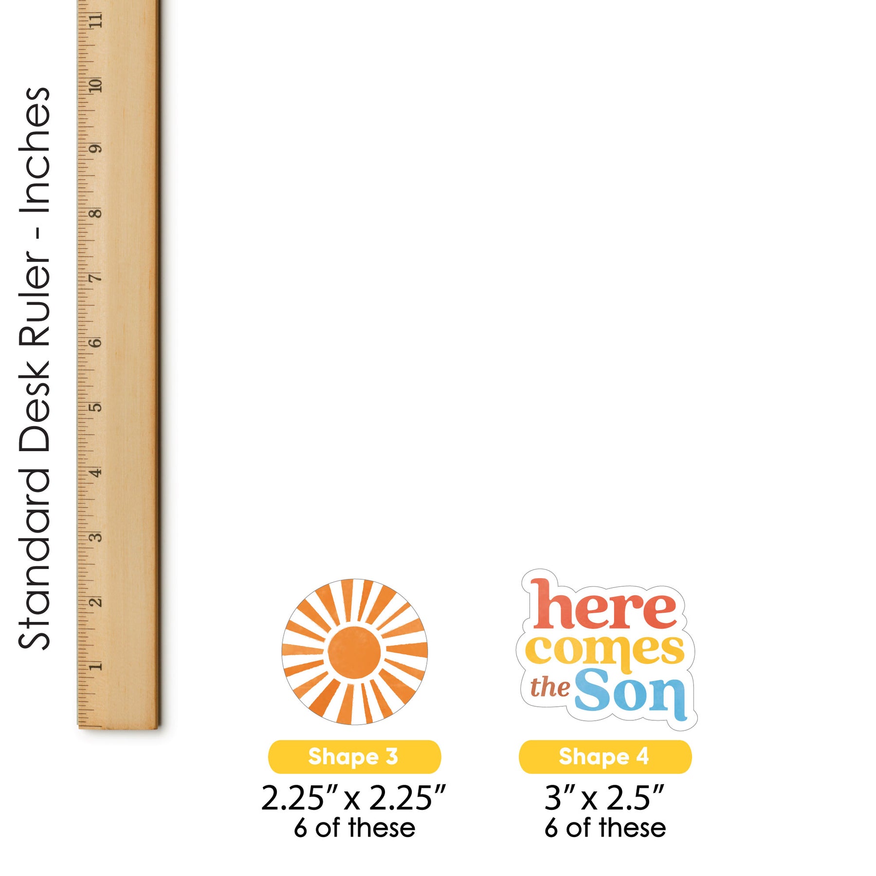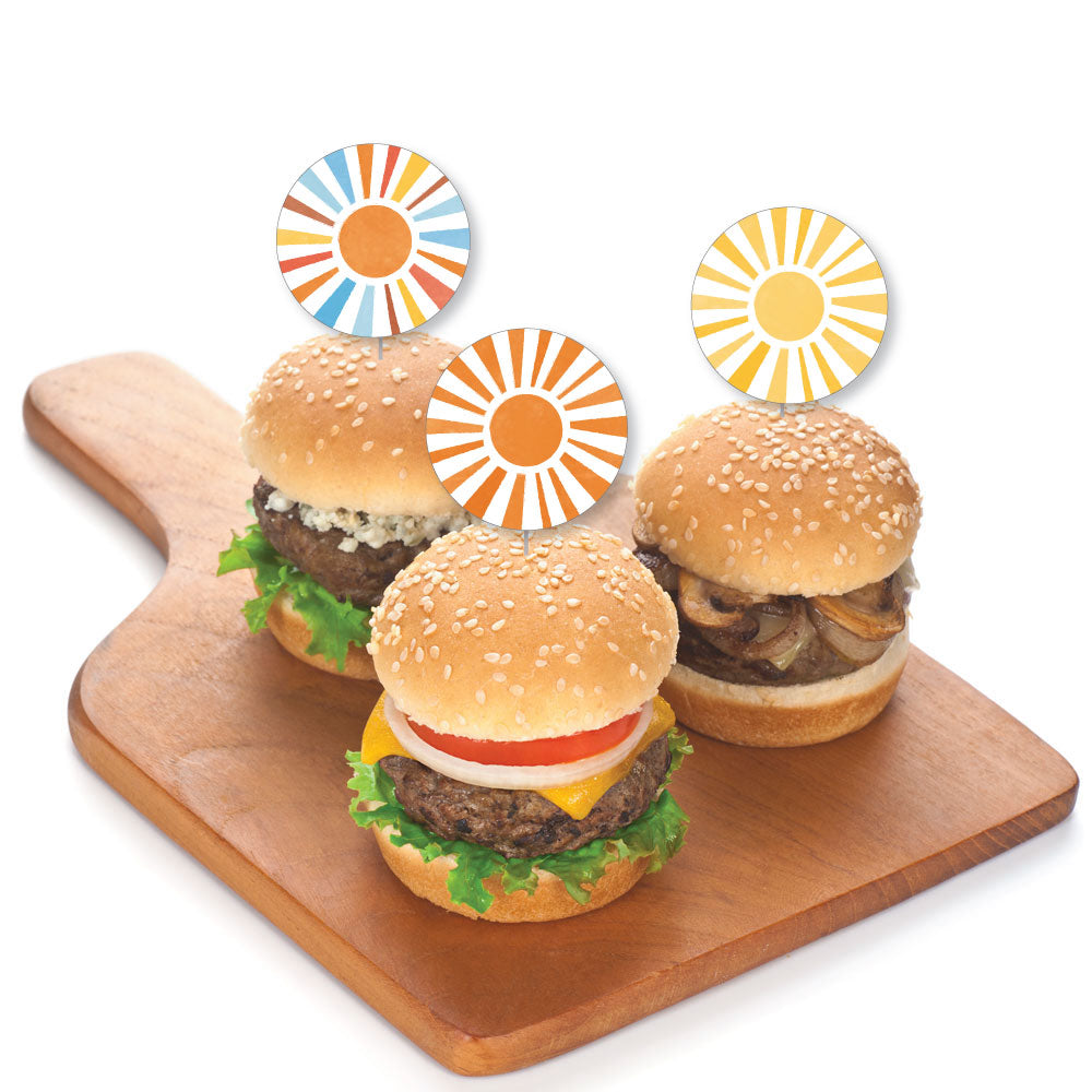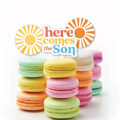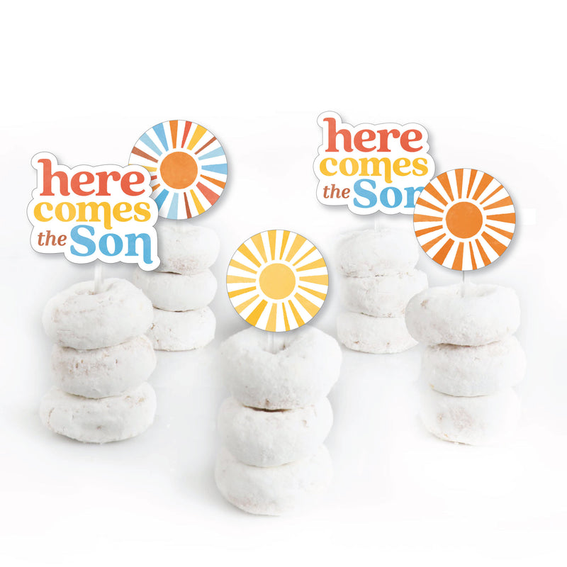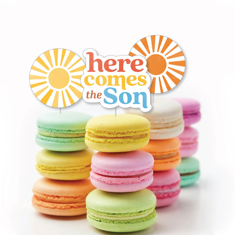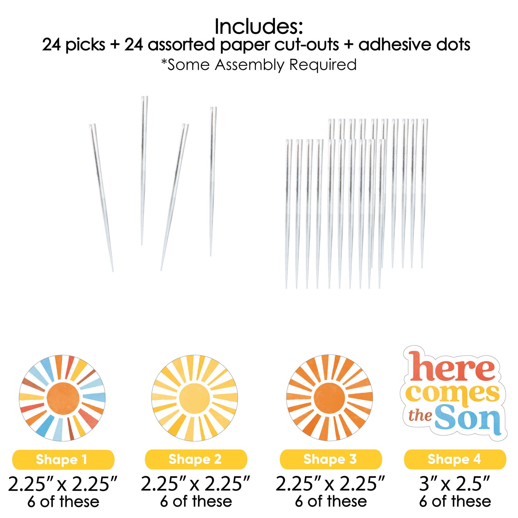 Create a unique dessert bar at your Party with Here Comes The Son Cupcake Toppers. This do-it-yourself kit includes clear treat picks and fun retro-inspired cut outs. Simply attach each double-sided paper cut out to a clear plastic pick with the included clear stickers. Dessert Cupcake Toppers look great on standard cupcakes or add them to other baked goodies such as brownies or donuts. Other appetizers and miniature fruit kabobs are also easy to make with these fun food picks.