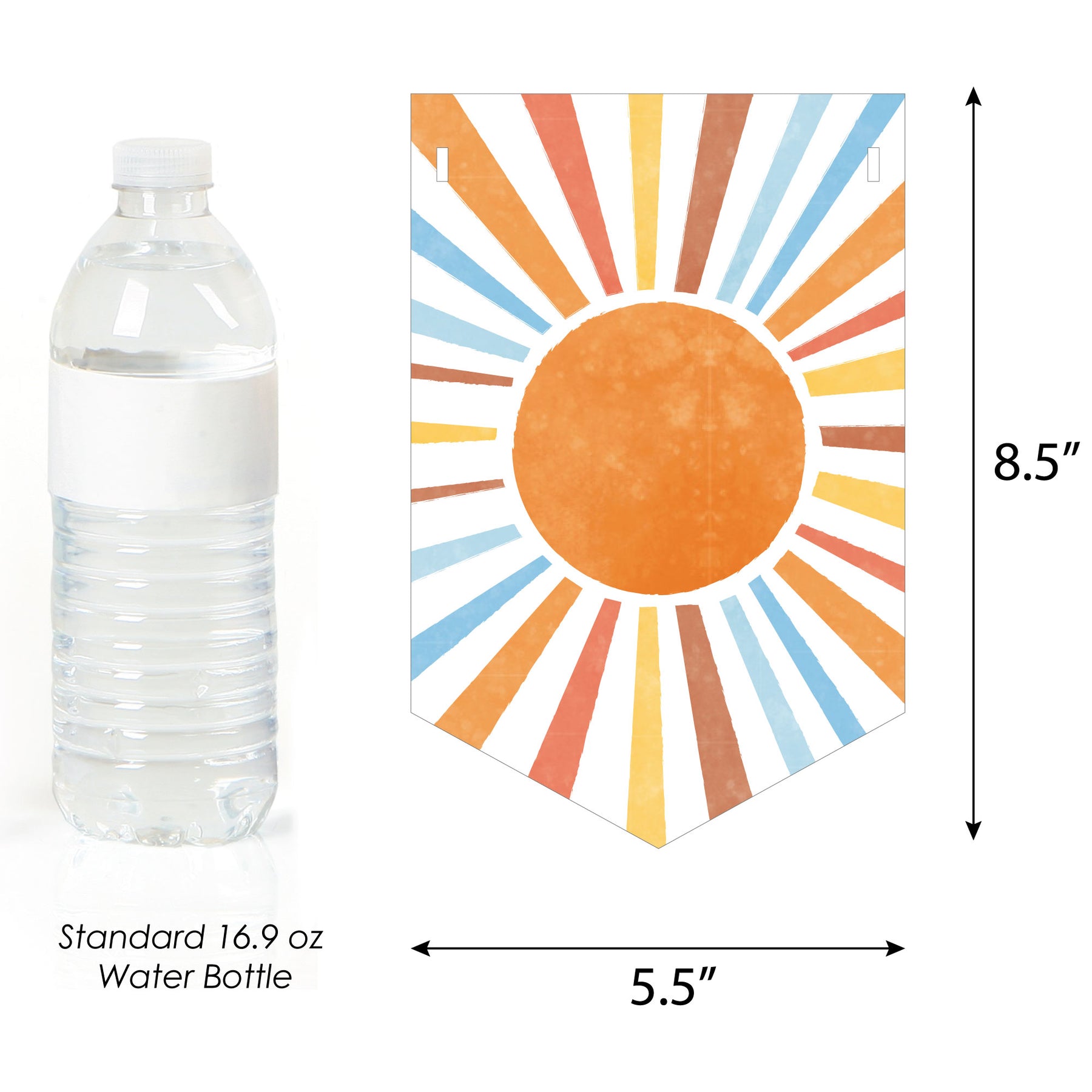 Here Comes The Sun, Buting Banner, is a must-have decoration for your retro sun-themed baby shower. Featuring adorable Sunshine-themed party pennants and "Here Comes The Son" lettered pennants, this banner adds the perfect touch to your baby shower party decor. Easily assemble the bunting banner with the included white ribbon and create a charming focal point for your celebration.