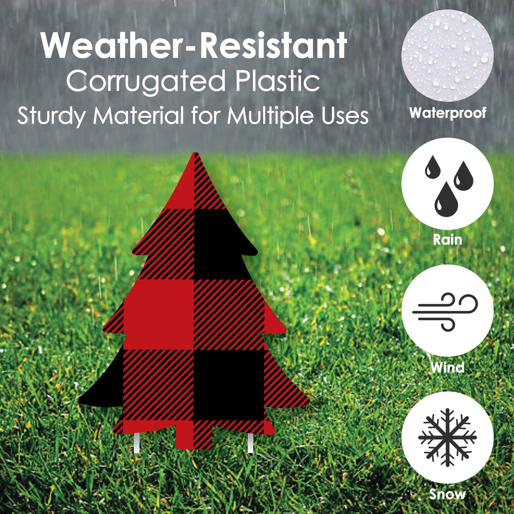 An impressive Holiday Plaid Trees yard sign is sure to delight your guests and surprise everyone. This 10-piece set of Buffalo Plaid Christmas lawn decorations is professionally printed with vivid colors to really make a statement wherever it is used. Each shaped outdoor Holiday Plaid Trees sign comes with two stakes, making it easy to display on lawns, driveways or courtyards. Best of all, Holiday Plaid Trees shapes are cut separately so you can arrange them any way you please. This decorative yard sign is made of waterproof plastic and is weather resistant, perfect for short-term display but can be used again and again with proper care.