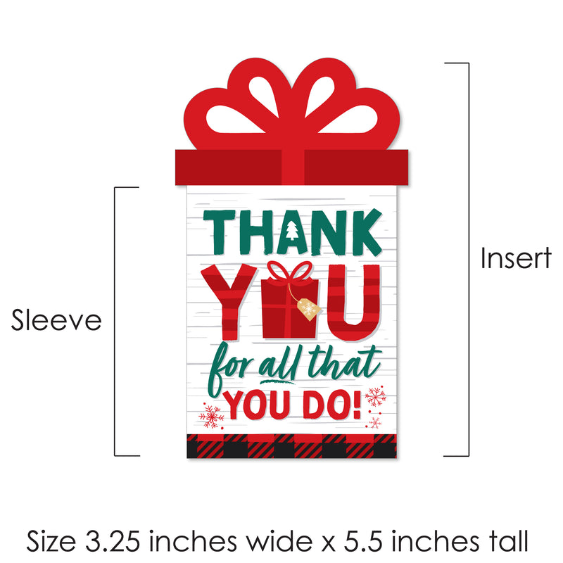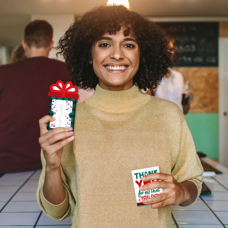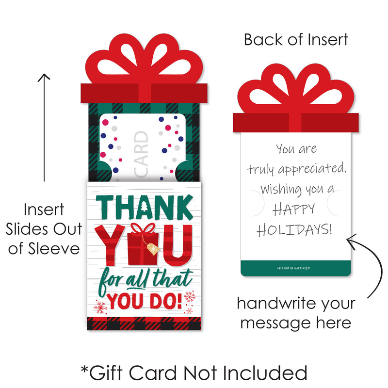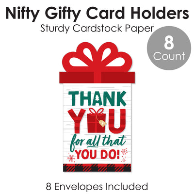 Take the guesswork out of “what to give” your guests of honor when you hand them these Holiday Thank You Nifty Gifty Card Holders filled with money or pre-paid gift cards. Each card holder is professionally printed on heavy-duty cardstock paper, with a unique cut and design that is sure to stand out. To prepare your gift, simply pull the insert out of the card holder sleeve and insert money or a gift card into the pre-cut tabs. You can even use the space on the back of the insert to write a personal message. For all your next Winter Holiday or Christmas parties, these card holders are a convenient and easy way to show how much you care!