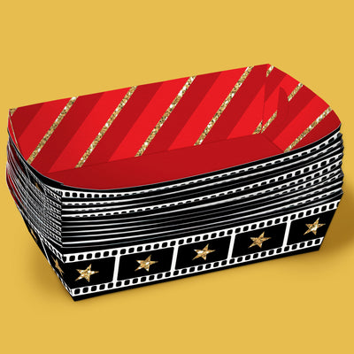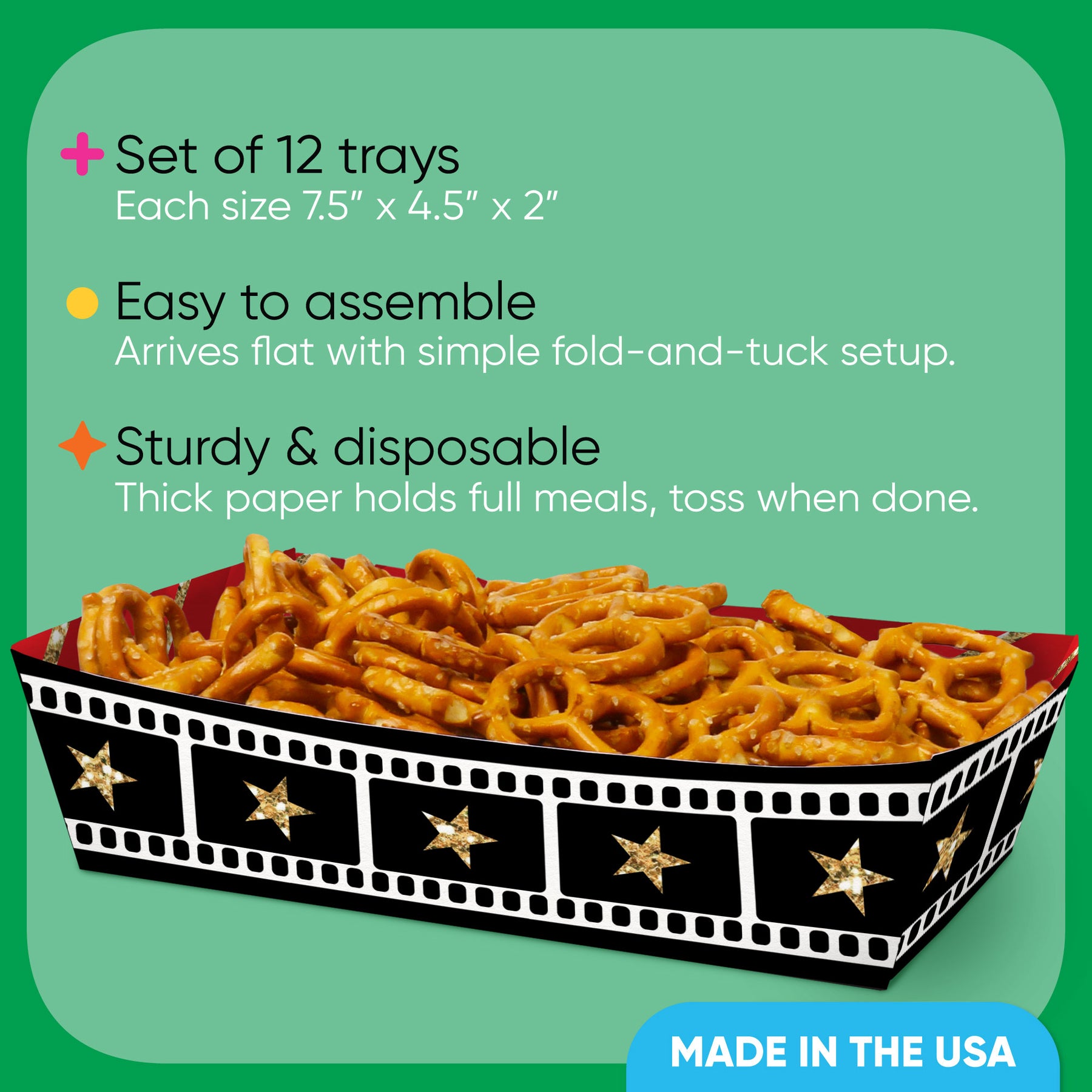 Serve up fun with this set of 12 disposable paper food trays, the perfect way to add a festive flair to your Red Carpet Movie Night party table! Each tray is double-sided with vibrant, professionally printed patterns on both the inside and outside, making your food setup look effortlessly cute. Measuring 7.5” x 4.5” x 2”, these sturdy trays can hold everything from hot dogs and French fries to nachos, burgers, appetizers, or even slices of cake. Perfect for kids’ birthday parties, backyard BBQs, school events, and summer gatherings, these food boats are an easy upgrade from plain paper plates. They ship flat and assemble quickly with simple folding — no glue or tape needed. Whether you call them food trays, paper boats, or snack holders, you’ll love how these add style and function to your food display. Plus, they’re proudly designed & made in the Midwest.