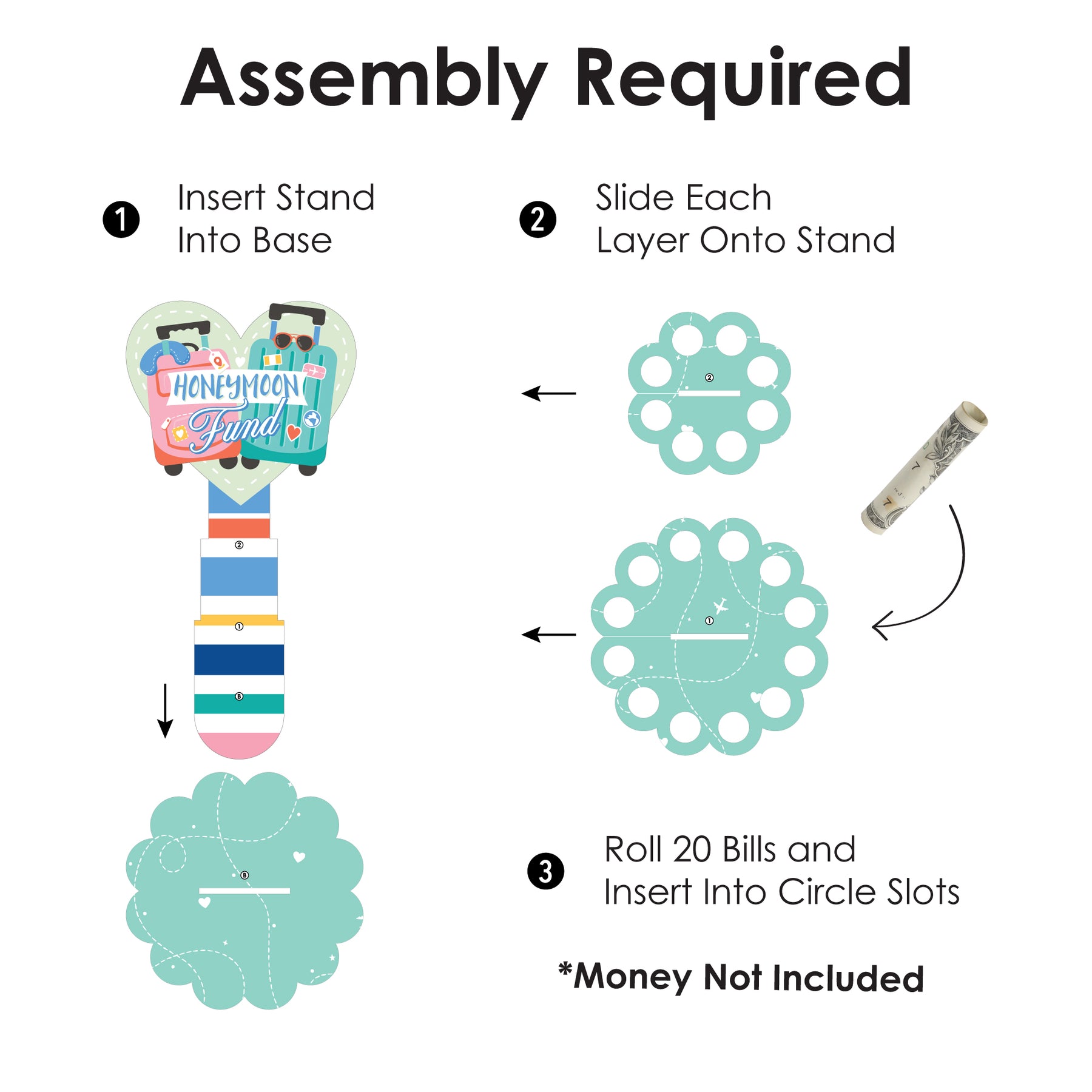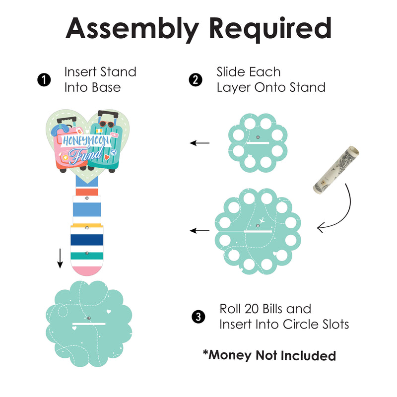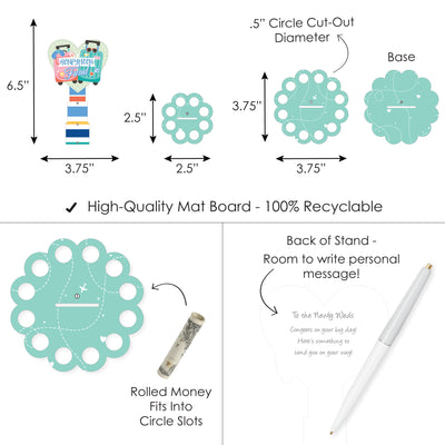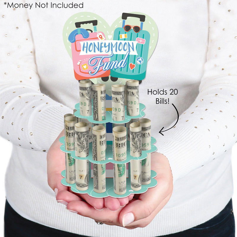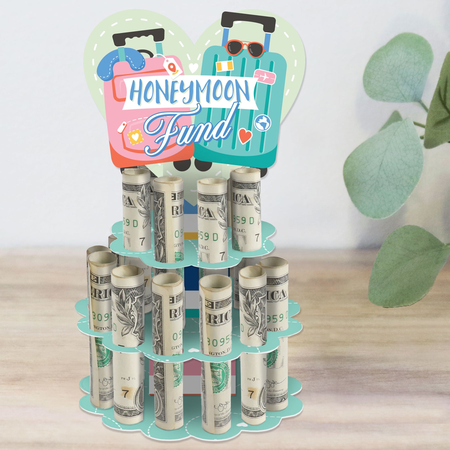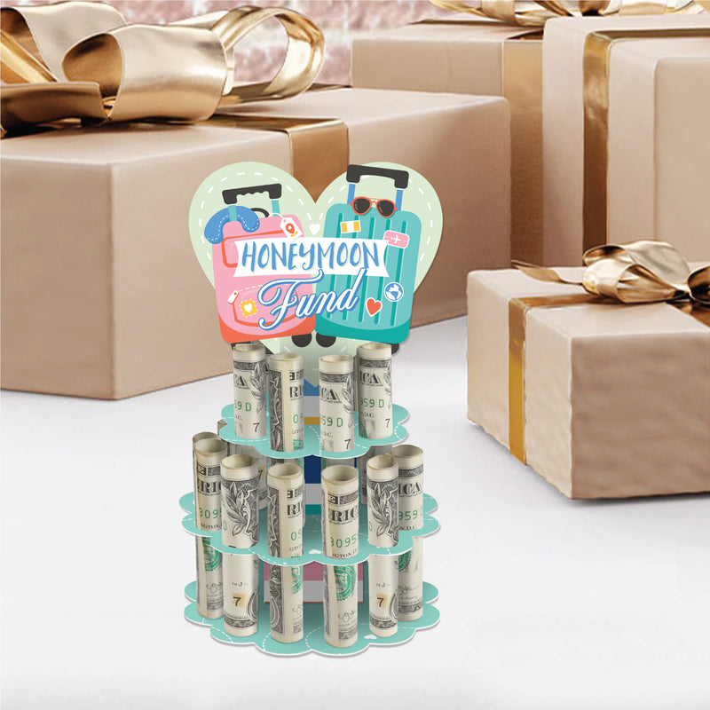 Wow, your special person when you present them with a Honeymoon Fund Cash Cake! A fun and creative way to gift money, this DIY cash holder stand kit comes in a 2-tier cake shape when put together and will have 20 slots, size 0.5” in diameter, that can hold your rolled money. To assemble, simply attach the centerpiece stand through the base piece and fold the half-circle ends at the bottom in opposite directions. Secure them into place using adhesive dots. Then, slide your layers onto the stand & add your rolled-up bills into the circle slots. For a special touch, add in some rolled-up advice notes or write a personalized message on the backside of the stand. The colorful cash holder is an impressive gift and table party decoration statement piece that will delight your guest of honor and partygoers with its eye-catching display. They will appreciate receiving a practical and meaningful gift and enjoy the flexibility of using the cash gift however they choose.