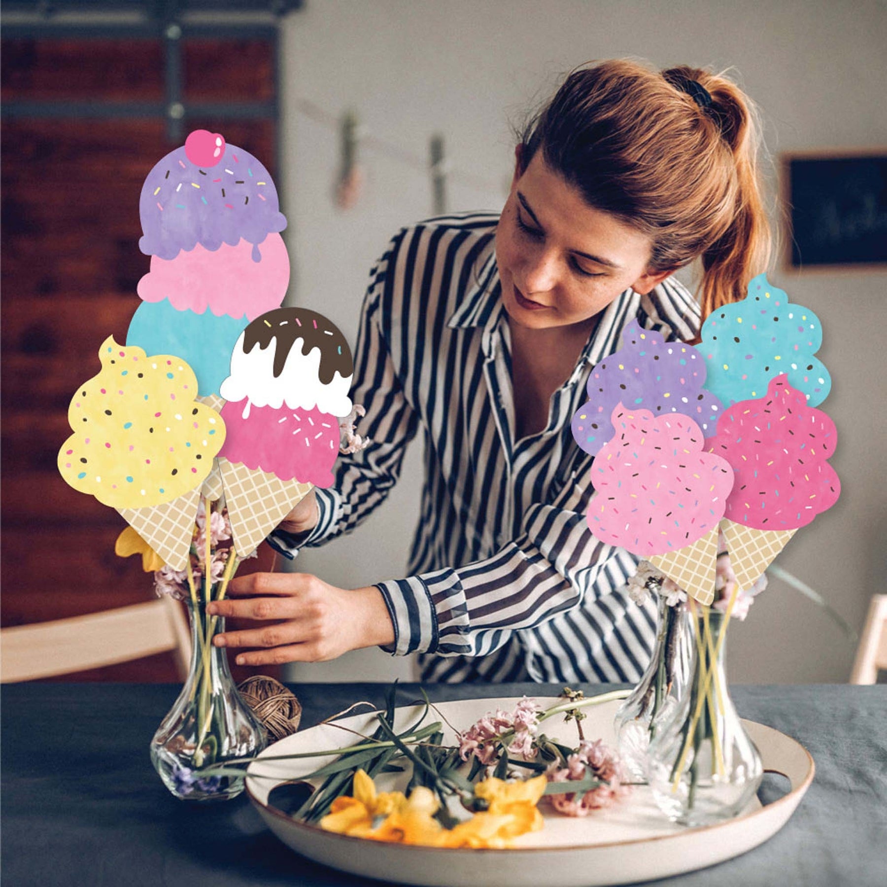 Whether hosting a large group celebration with multiple tables or inviting your closest friends over for a Scoop Up The Fun - Ice Cream baby shower or birthday party, create easy DIY party centerpieces with our 35-piece showstopper table toppers. Scoop Up The Fun - Ice Cream table topper cut-outs are professionally printed double-sided on sturdy cardstock paper with a photo-like shine and include 35 table topper sticks and clear stickers for at-home assembly. Add assembled centerpiece sticks to floral vases, candy jars, or any sturdy container to place in the center of dining tables, at candy buffets, or the party's welcome entrance.