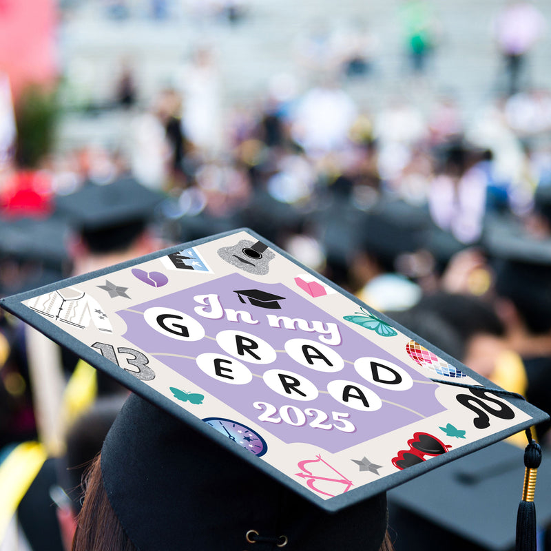 Decorate your mortarboard graduation cap to stand out from the crowd of classmates on graduation day. In My Grad Era Grad Cap Cover includes top piece, base piece, and poster mounts to DIY assembly an “In My Grad Era 2026” graduation cap topper. Use the printed guides on each the top piece and base piece to align placement of In My Grad Era Grad Cap Cover. The base piece will cover majority of mortarboard and top piece will give the design a three-dimensional element that covers the tassel button. Poster mounts are provided to easily attach Grad Cap Cover to the top of mortarboard and help easily move tassel from left to right. After the commencement ceremony, use The Taylor inspired Grad Cap Cover for a fun graduation keepsake.