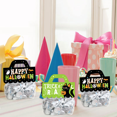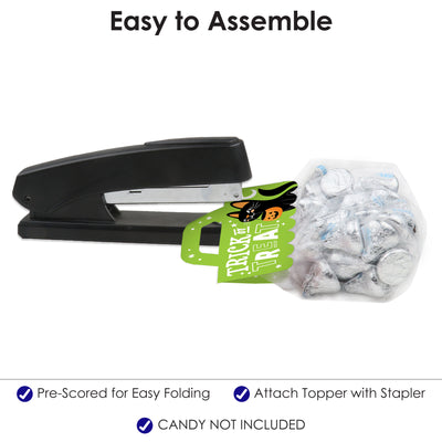 Delight your guests when you use the set of 24 Jack-O’-Lantern Halloween Candy Bags with Toppers to add a little DIY magic to your Kids Halloween Party favors! Adorable and easy to use, this goodie kit includes food-safe clear treat bags and scalloped-edge topper labels with a built-in handle that come in 2 designs. Candy labels are professionally printed double-sided on sturdy cardstock paper and include a to and from section on the back for easy personalization. To use Jack-O’-Lantern Halloween treat bags with toppers, begin by filling treats inside the plastic bag. Then, handwrite the information on the to and from section and let the ink dry before folding the label along the pre-scored line. Place the flaps over the top of the candy bag and secure it shut with staples. Jack-O’-Lantern Halloween bag toppers measure 3” wide by 4.25” tall and clear bags measure 3.75” wide by 9.75” tall. Display candy bags with toppers at your dessert table or give them as take-home party favor bags. Make your celebration unforgettable when you present your guests with the Jack-O’-Lantern Halloween Candy Bags with Toppers!