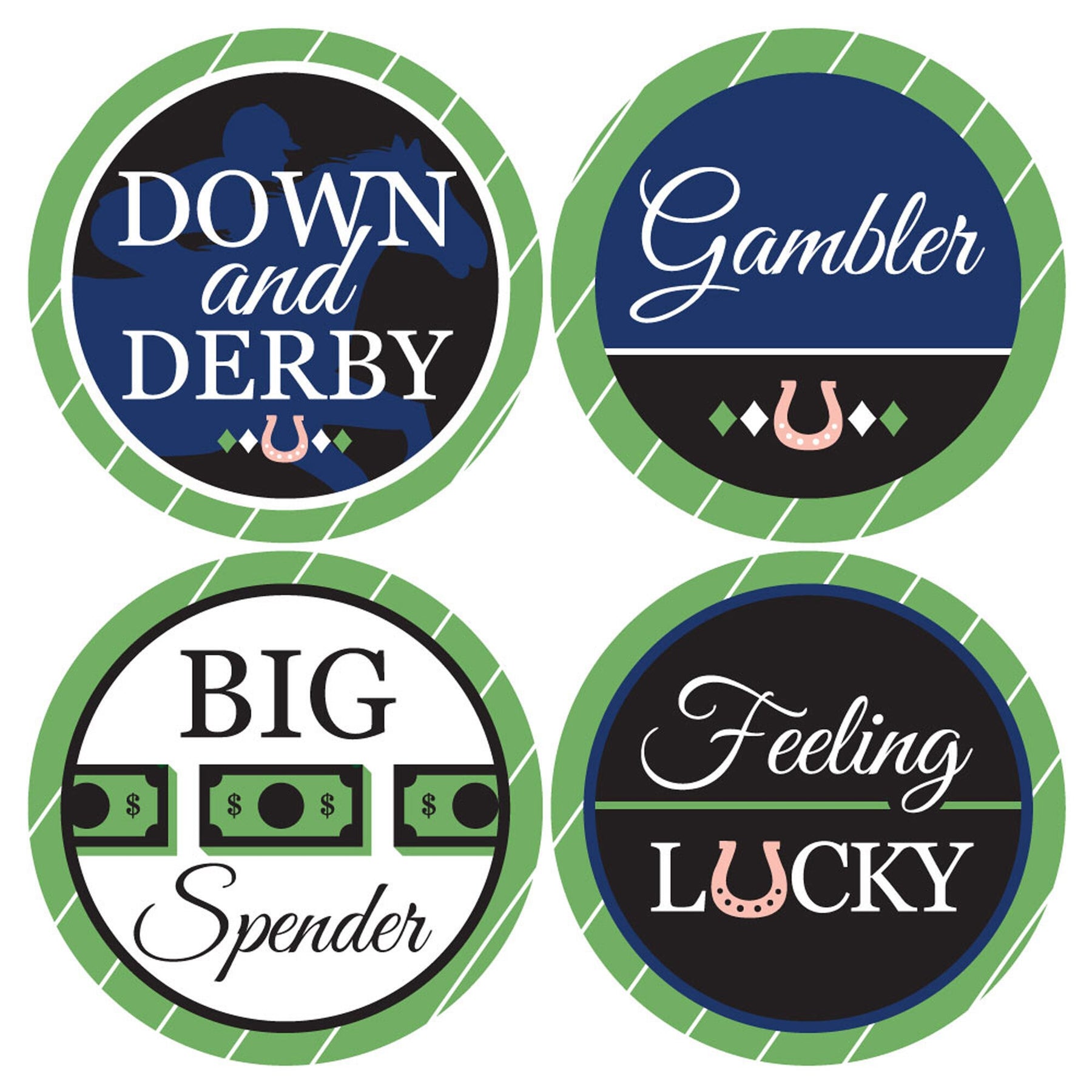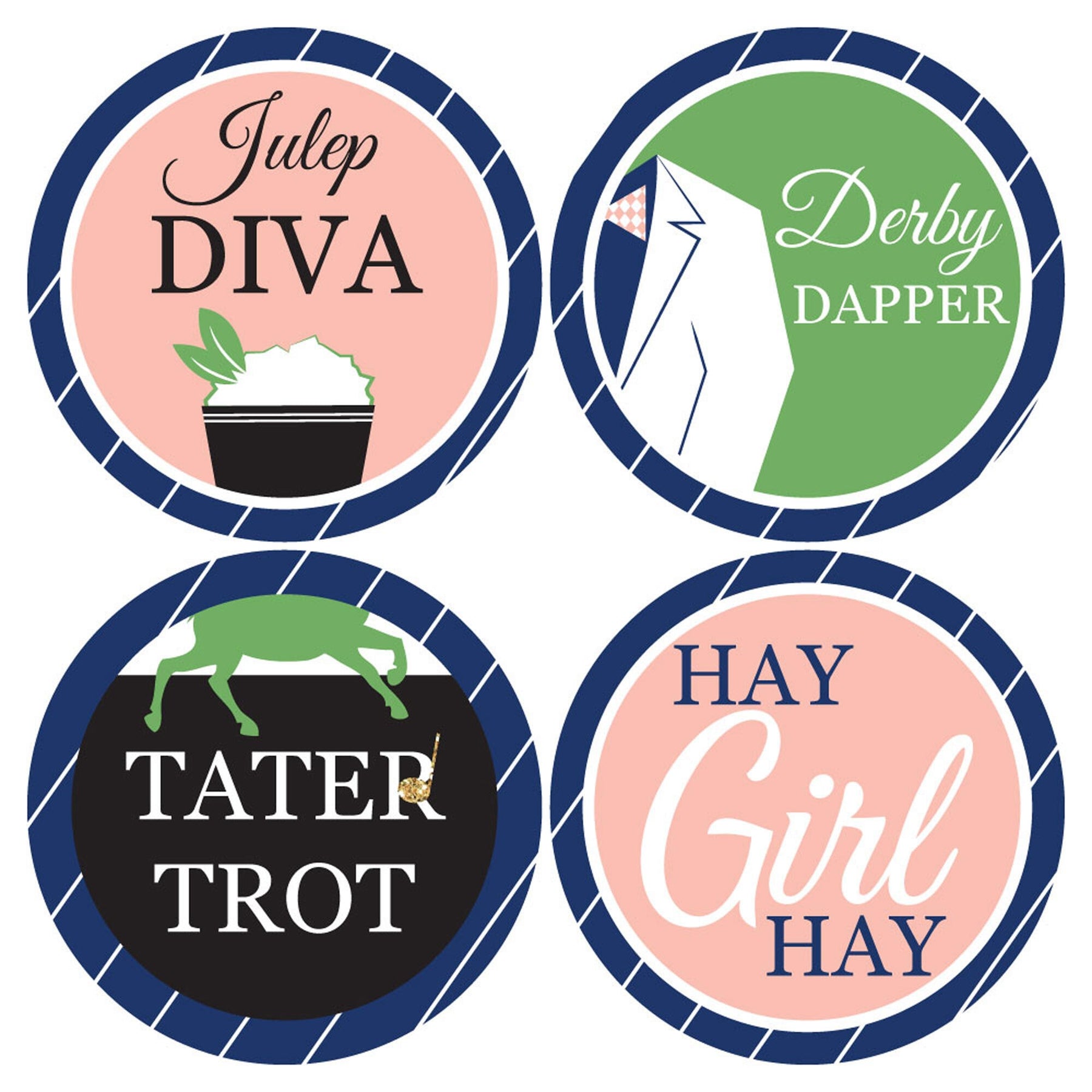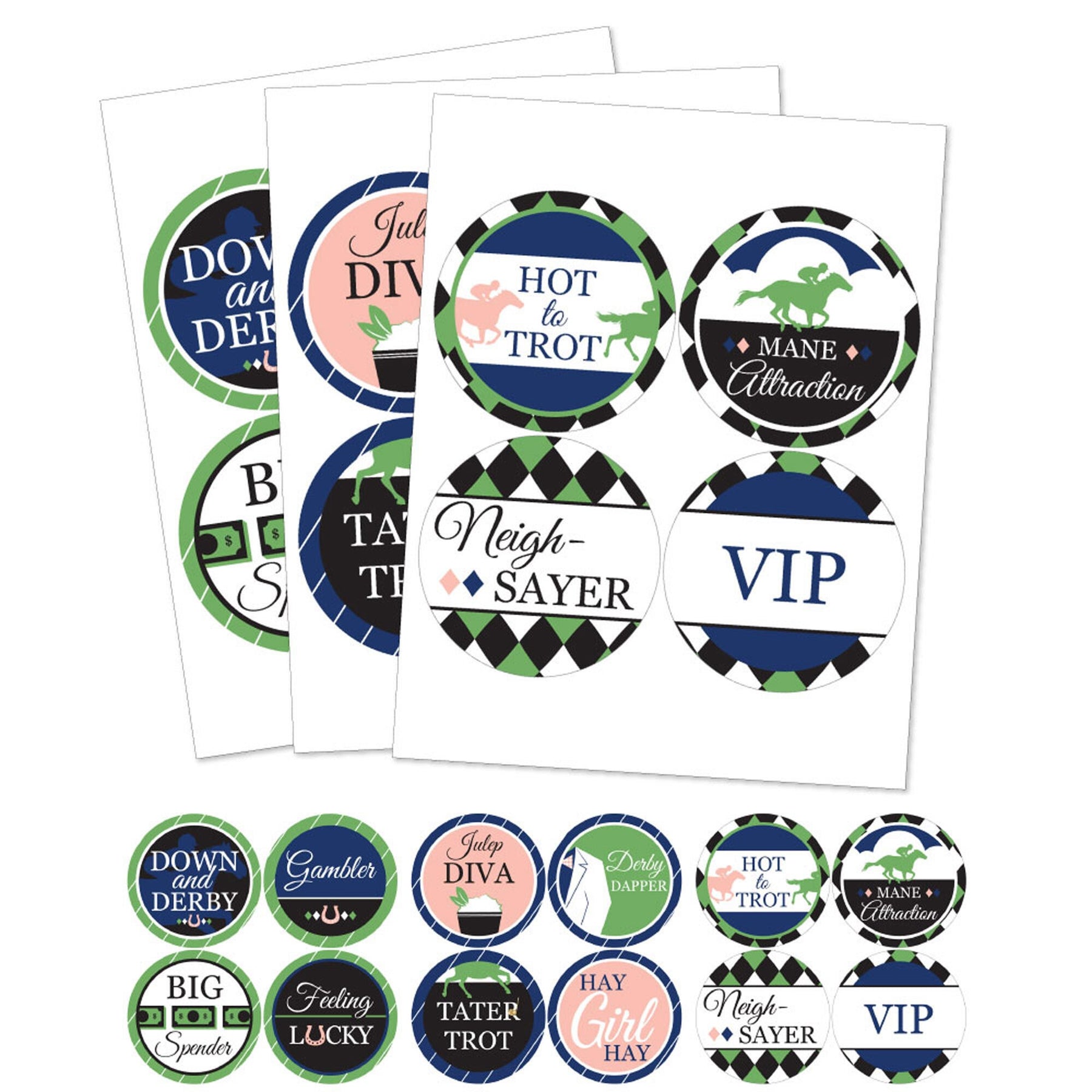 12 Name Tags Include: HOT TO TROT, MANE ATTRACTION, NEIGH-SAYER, VIP, JULEP DIVA, DERBY DAPPER, TATER TROT, HAY GIRL HAY, DOWN AND DERBY, GAMBLER, BIG SPENDER, FEELING LUCKY