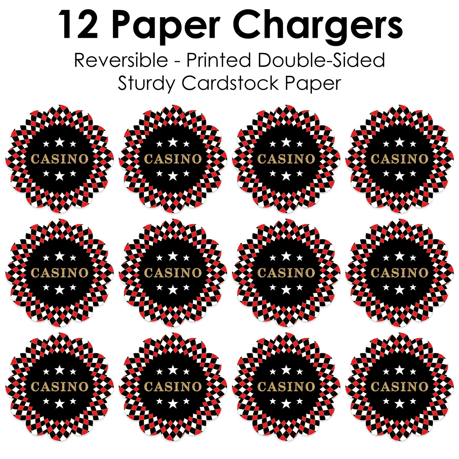 Refine your table place setting at your Retirement or Birthday Party when you use the set of 12 Las Vegas Paper Chargers. A decorative base for your tableware, paper chargers are an excellent substitute for doilies and an easy solution to creating an exciting look at your table. To use, place a paper charger at each guest’s place setting, and flare up the scallop border for a stylish finish. Then add a plate to the center of the paper charger. Each plate will be highlighted and between meals, your table will maintain a decorative and coordinated appearance. These disposable paper chargers will also make cleanup easy after the celebration is over. Professionally printed double-sided on sturdy cardstock paper with a photo-like shine, chargers are reversible and can be used on the backside for an alternate look. Each Las Vegas chargers measure 11.25” in diameter. Impress your guests when you use the Las Vegas Paper Chargers at your celebration.