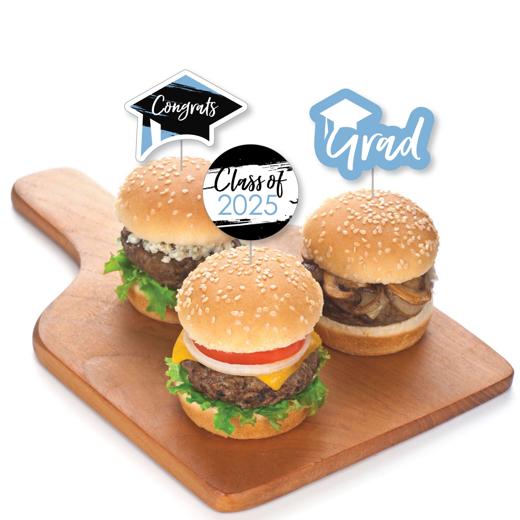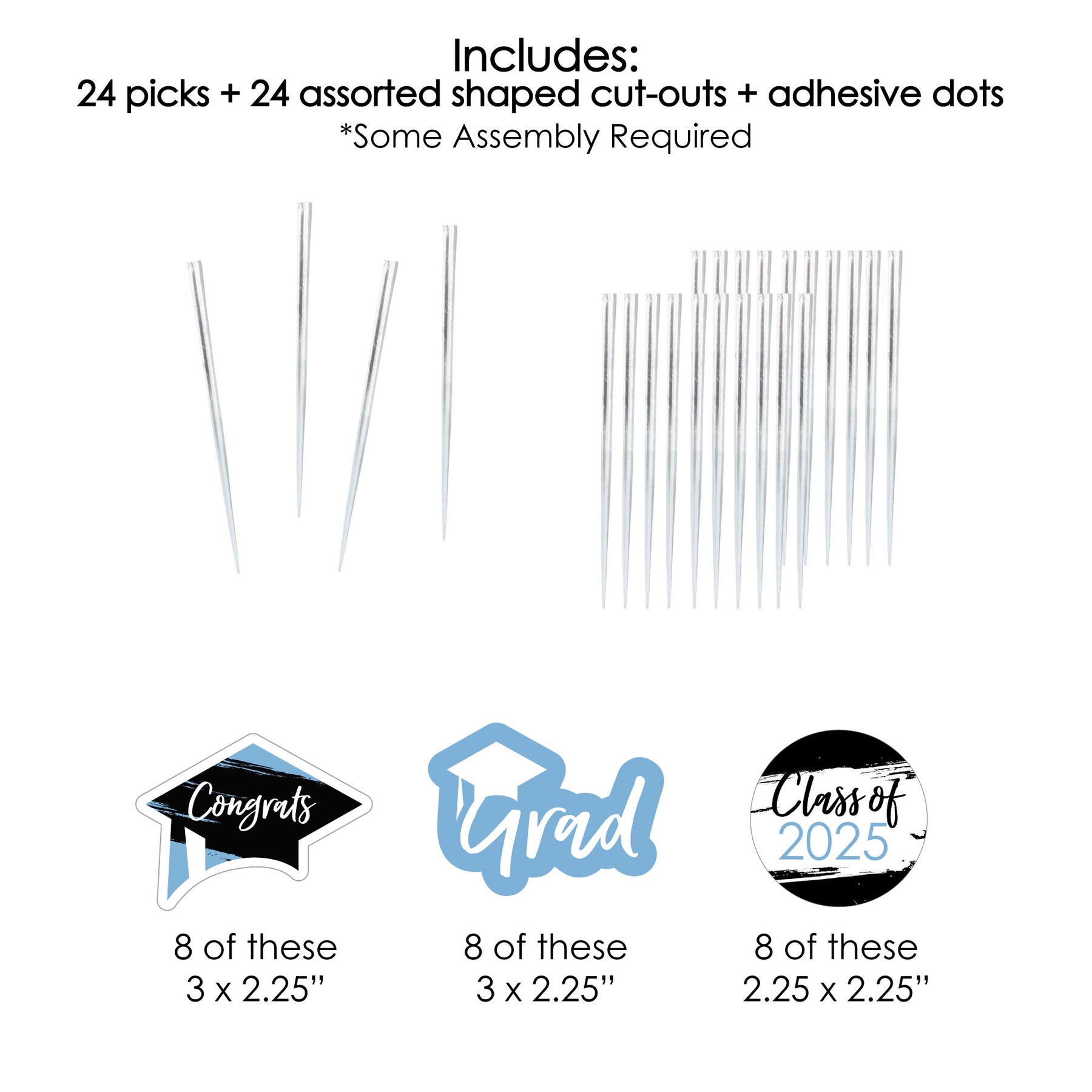 Create a unique dessert bar at your Graduation Party with Light Blue Grad - Best is Yet to Come Dessert Cupcake Toppers. This do-it-yourself kit includes clear treat picks and fun shaped cut outs. Simply attach each double-sided paper cut out to a clear plastic pick with the included clear stickers. Dessert Cupcake Toppers look great on standard cupcakes or add them to other baked goodies such as brownies or donuts. Other appetizers and miniature fruit kabobs are also easy to make with these fun food picks. Get creative and bring all your party ideas to life with Light Blue Grad - Best is Yet to Come Dessert Cupcake Toppers.