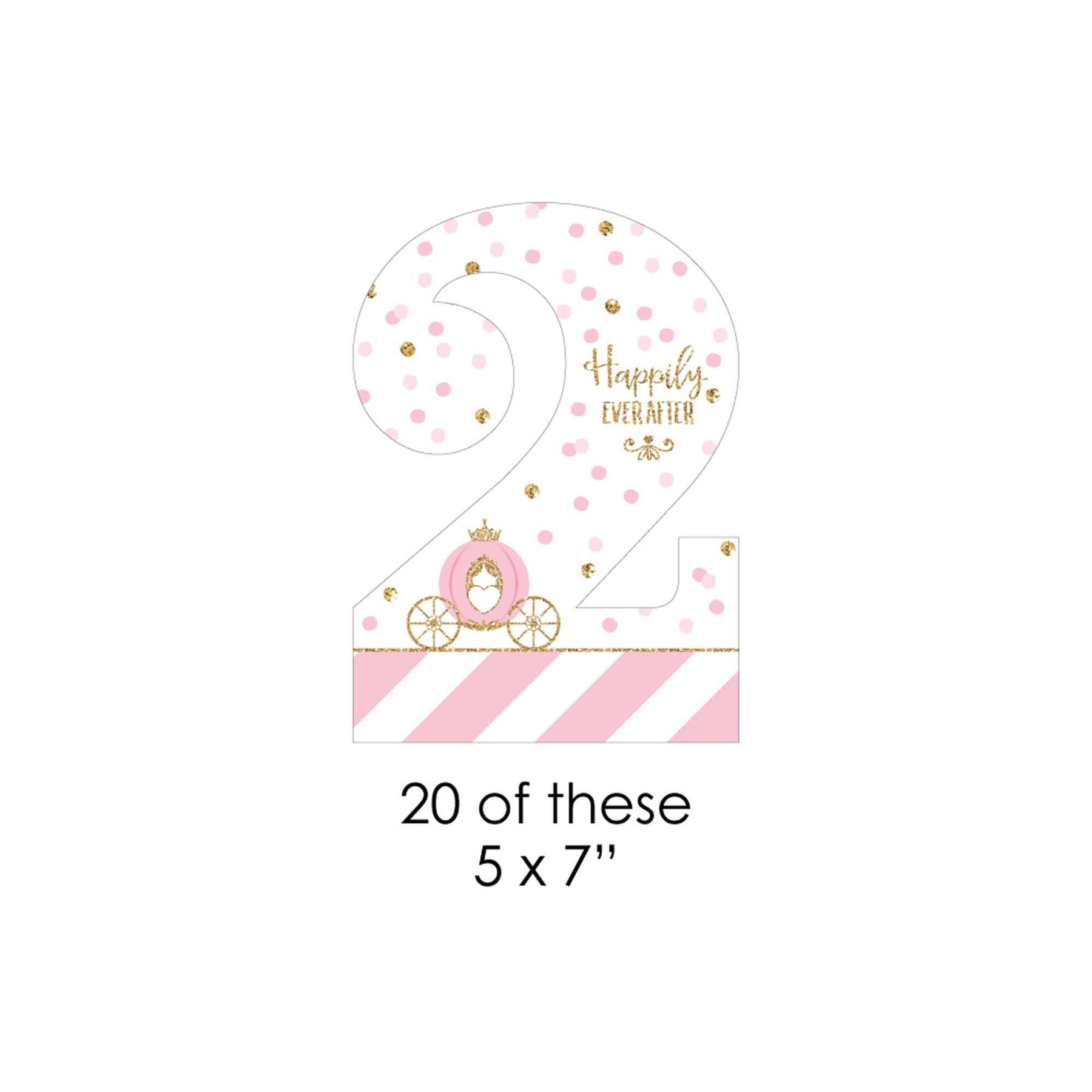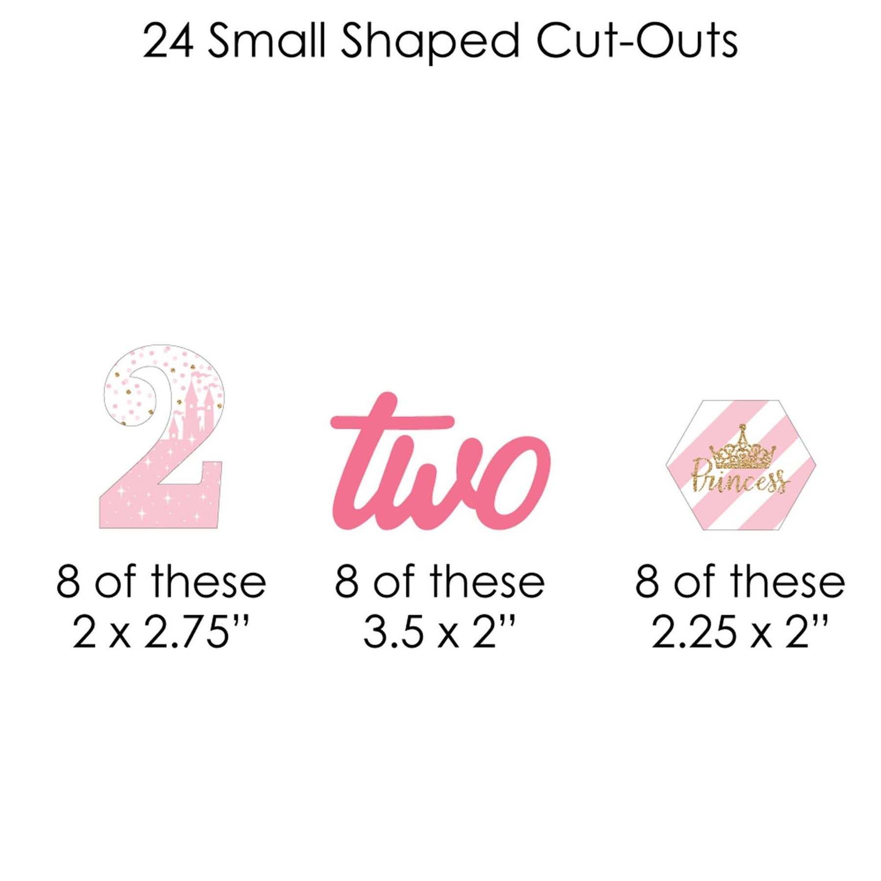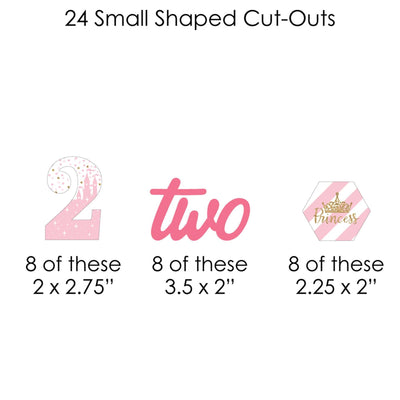 Easily decorate your Pink and Gold Princess Second Birthday Party with 2nd Birthday Little Princess Crown clothespin garland banner. This DIY banner kit includes 44-pieces of 2nd Birthday Little Princess Crown paper cut-outs, 50 mini clothespins, and white cord. Before hanging, plan out your desired pattern by alternating in sizes. Using a miniature clothespin, clip shapes on the included cord. Hang finished DIY garland banner at the entrance of your party, over mantelpiece, along buffet tables, or as high chair banner decoration. After the party, reuse the clothespins and cord to hang event photos as a fun keepsake. 2nd Birthday Little Princess Crown large cut-outs are professionally printed double-sided, small cut-outs are professionally printed with coordinating pattern on back, and all on sturdy cardstock paper with a photo-like shine.