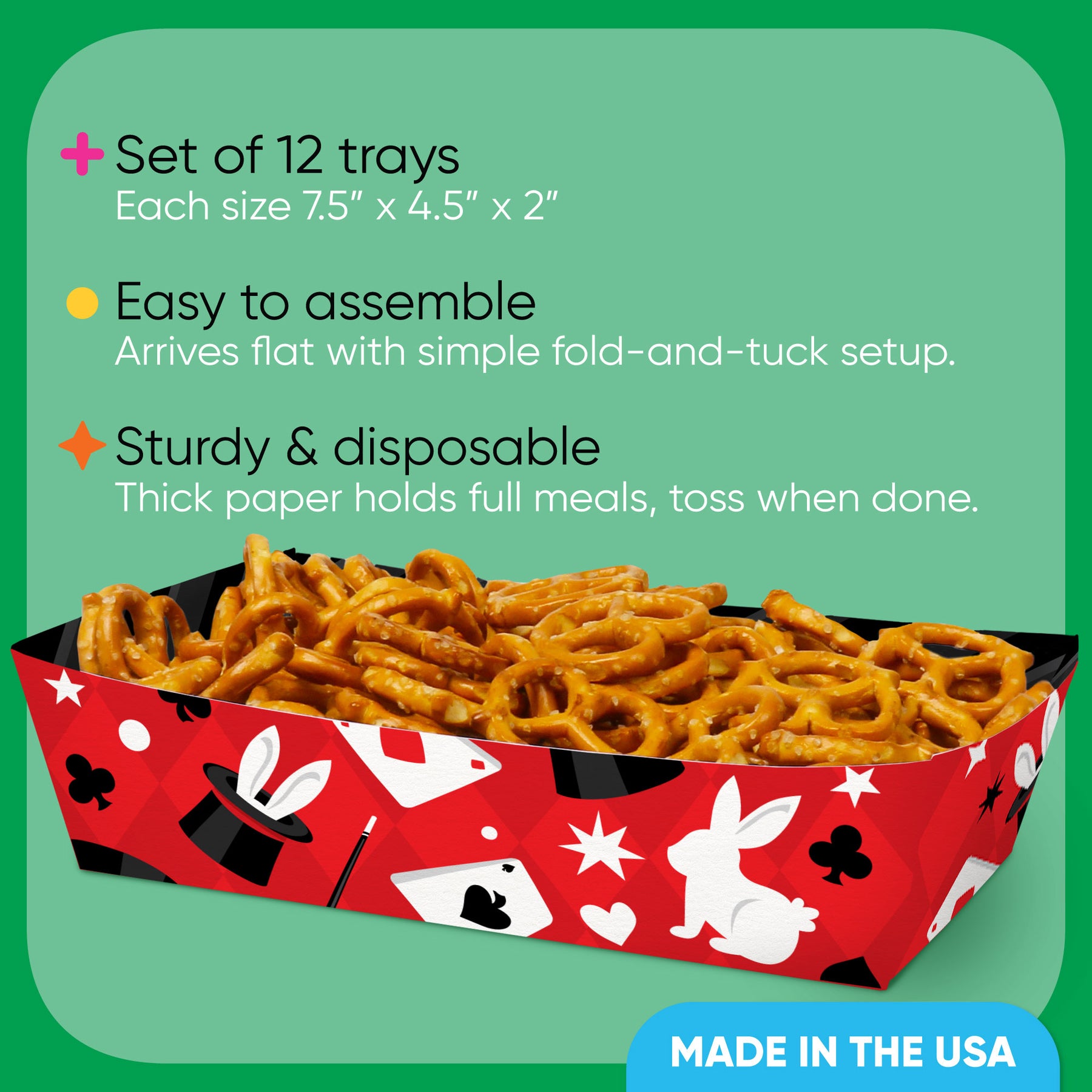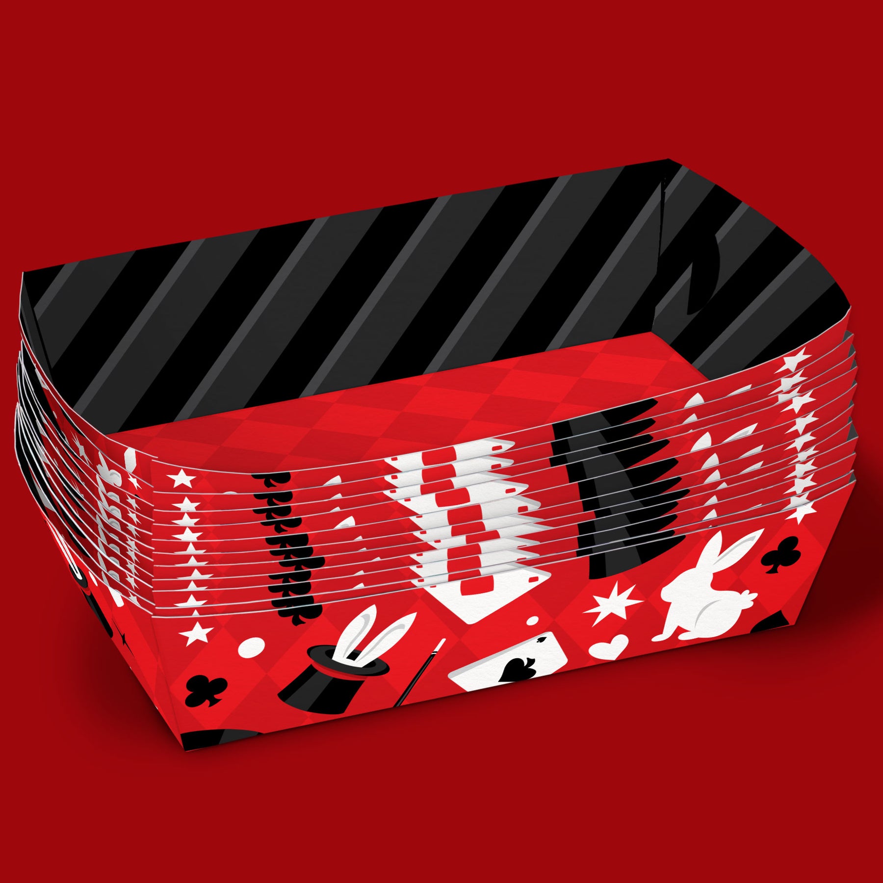 Serve up fun with this set of 12 disposable paper food trays, the perfect way to add a festive flair to your Magic Show party table! Each tray is double-sided with vibrant, professionally printed patterns on both the inside and outside, making your food setup look effortlessly cute. Measuring 7.5” x 4.5” x 2”, these sturdy trays can hold everything from hot dogs and French fries to nachos, burgers, appetizers, or even slices of cake. Perfect for kids’ birthday parties, backyard BBQs, school events, and summer gatherings, these food boats are an easy upgrade from plain paper plates. They ship flat and assemble quickly with simple folding — no glue or tape needed. Whether you call them food trays, paper boats, or snack holders, you’ll love how these add style and function to your food display. Plus, they’re proudly designed & made in the Midwest.