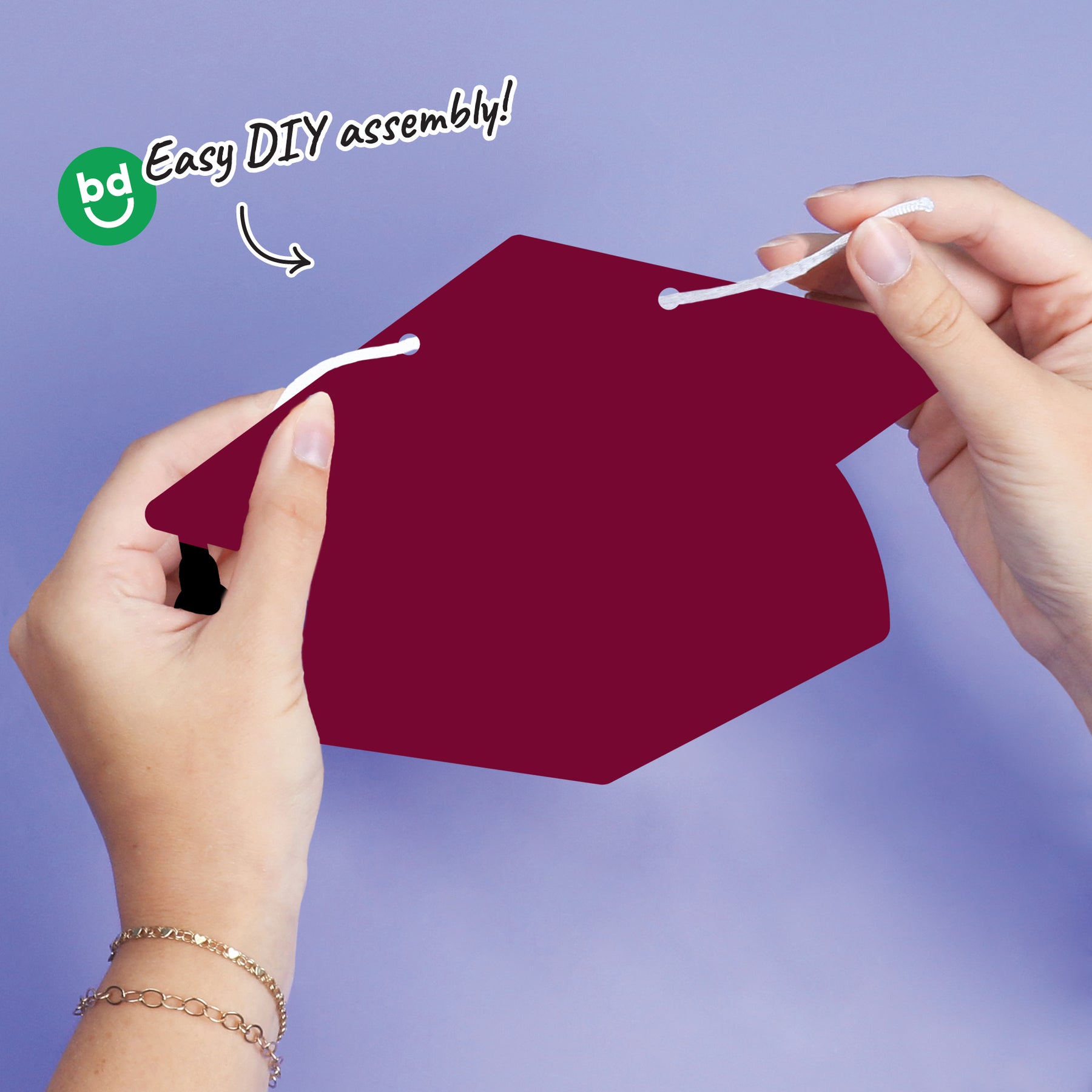 Brighten up your Graduation party with our maroon grad cap-shaped garland banner! This cute decoration creates a joyful atmosphere for your gathering. Perfect for setting the tone as celebrate! Our banner is double-sided for maximum impact and comes with 15 feet of white cording for easy DIY setup.