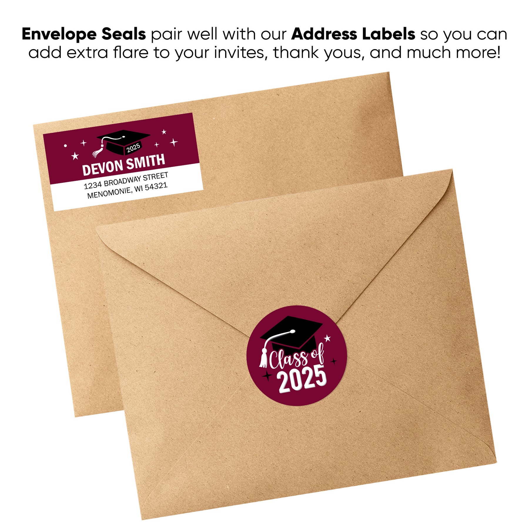 Seal the deal on your graduation party prep with our Class of 2026 Maroon Graduation Envelope Seal Stickers! These round stickers add a personal, polished finish to every invite or thank you card—no licking required (because, gross). Just peel and stick for an easy, adorable way to show off your grad’s big moment. With 120 seals total, there’s plenty to use on envelopes, favors, and anything else you want to dress up. Designed to match our graduation collections and printed in-house at our Wisconsin facility, they’re a simple way to add major charm to your snail mail. Pair these Envelope Seals with our Custom Return Address Labels to bring even more school color spirit to your graduation announcements.