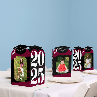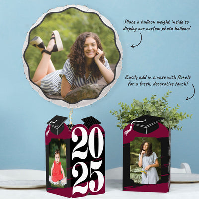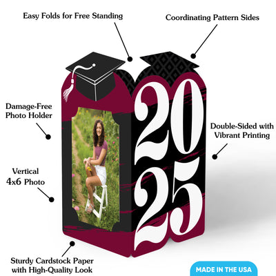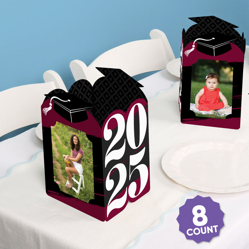 Planning a graduation party is no joke, but adding a personal touch has never been easier! These Maroon Graduation Party Photo Holder Centerpieces are a painless (and seriously fun) addition! This set of 8 cube-shaped centerpieces lets you show off your grad’s journey from kindergarten to senior year—perfect for displaying their K-12 school photos in one place. With space for up to 16 vertical 4x6 pictures, each centerpiece features two sides with secure tabs for photos and two sides with a bold “2026” design, making them a total conversation starter. Whether placed on dining tables, dessert stations, or the gift table, these centerpieces instantly add a personalized and festive touch. Want to get creative? Use them to hold 3-5” vases, 5” flower boxes, or even balloons for a custom party look. Made from sturdy cardstock paper with a glossy, photo-like finish, they arrive pre-assembled and ready to party—no DIY disasters here! Plus, with a coordinating interior pattern, they bring that polished, picture-perfect vibe to your maroon-themed grad celebration. Proudly made in the Midwest, these Class of 2026 centerpieces are an easy win for any grad party!