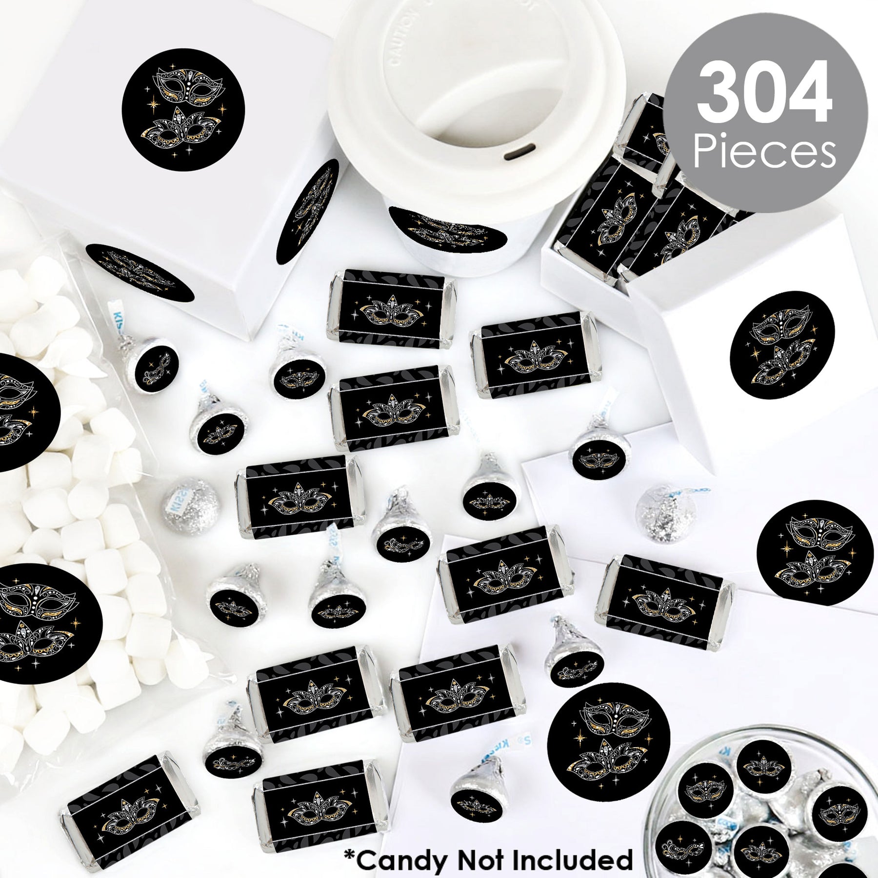 Wow your party guests when you coordinate the candy buffet and favors to your Prom or Venetian Mask Party theme with Masquerade Favor Kit: Candy Stickers. This 304-piece kit includes Mini Candy Bar Wrappers, Round Candy Stickers, and Circle Stickers. Easy assembly with peel and stick stickers, no tape needed. Simply center and press onto your favorite candies. Masquerade candy favor sticker kit is a fun way to add a unique touch to all areas of your party. Be creative with this DIY decoration and use for treats, centerpieces, place settings, favors, and more!
