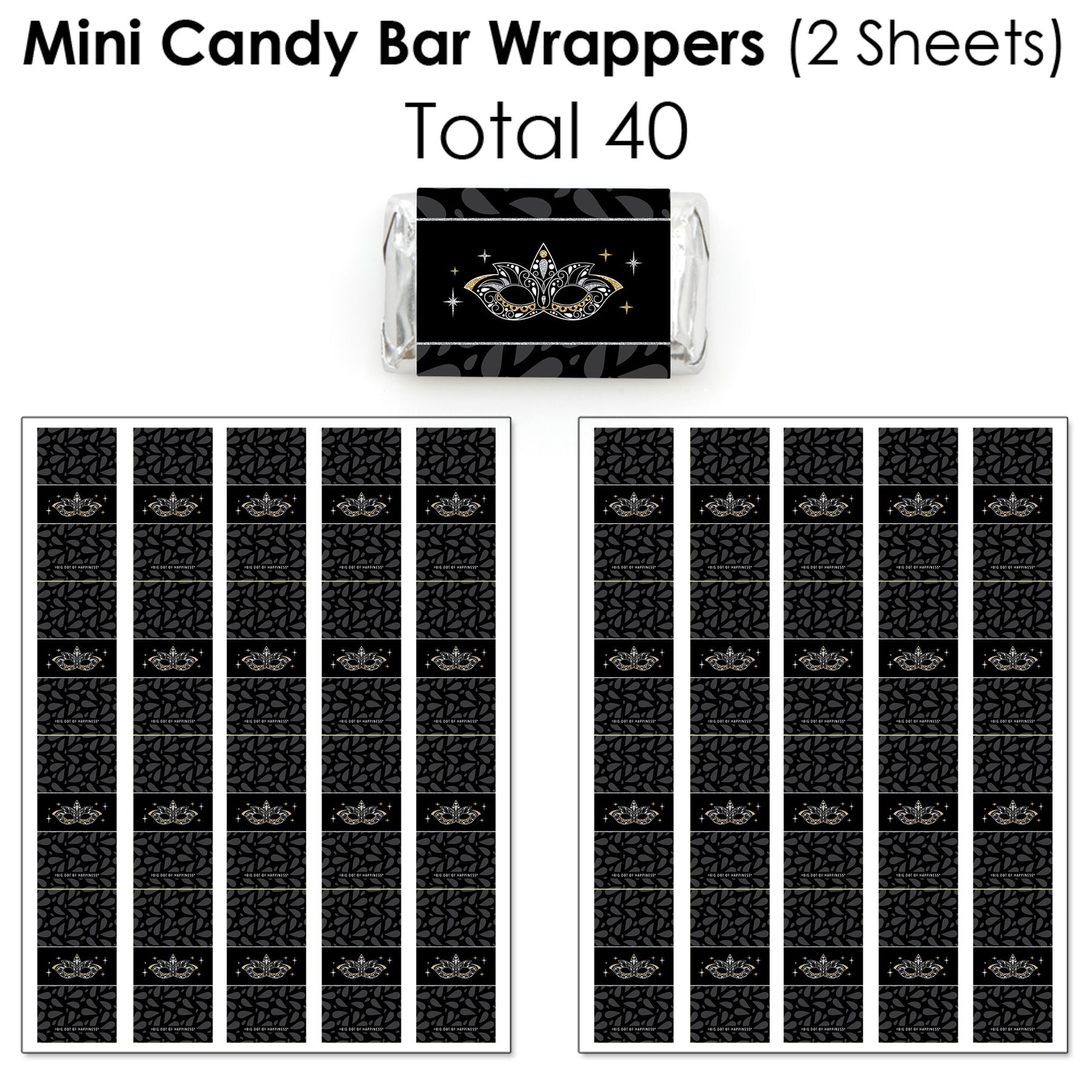 2 Sheets of Mini Candy Bar Wrappers (total 40) size 1.25 inches wide x 2.75 inches high and fit Hershey® Miniatures® candy bars.