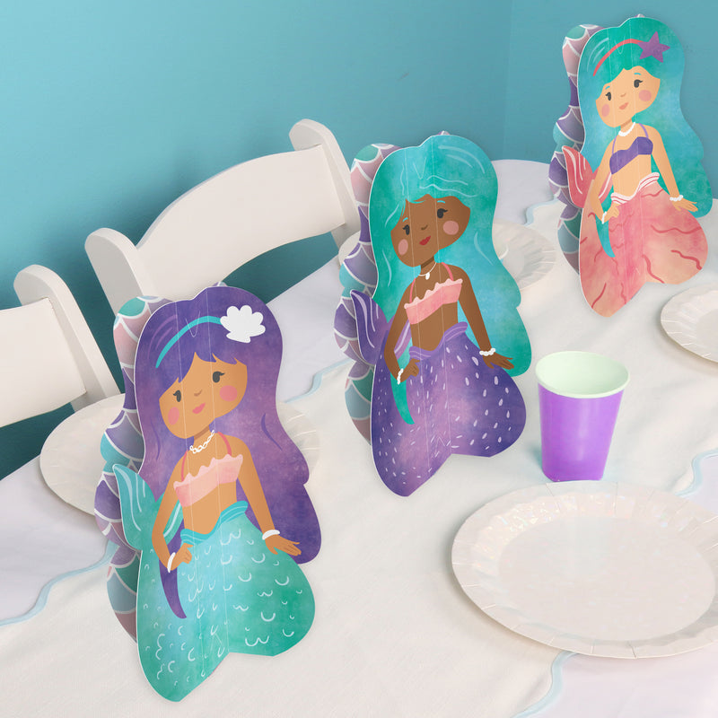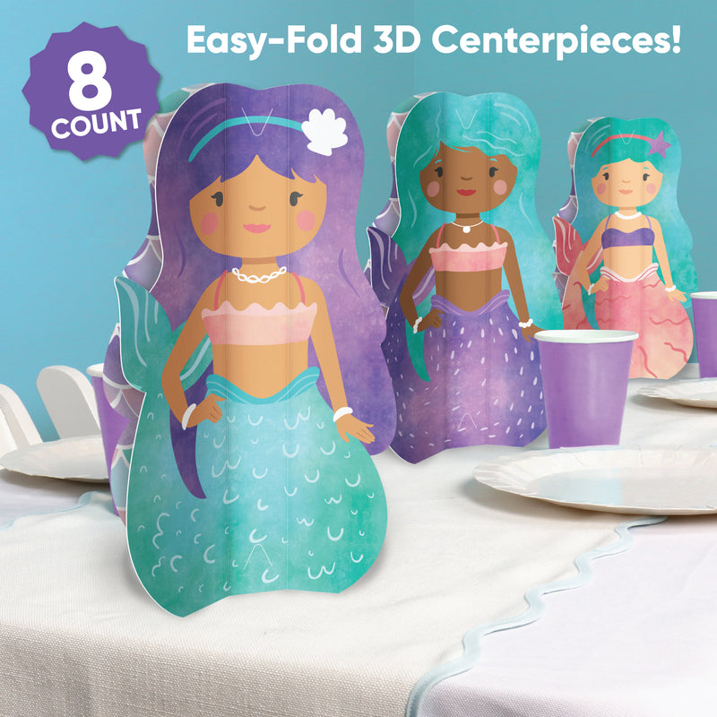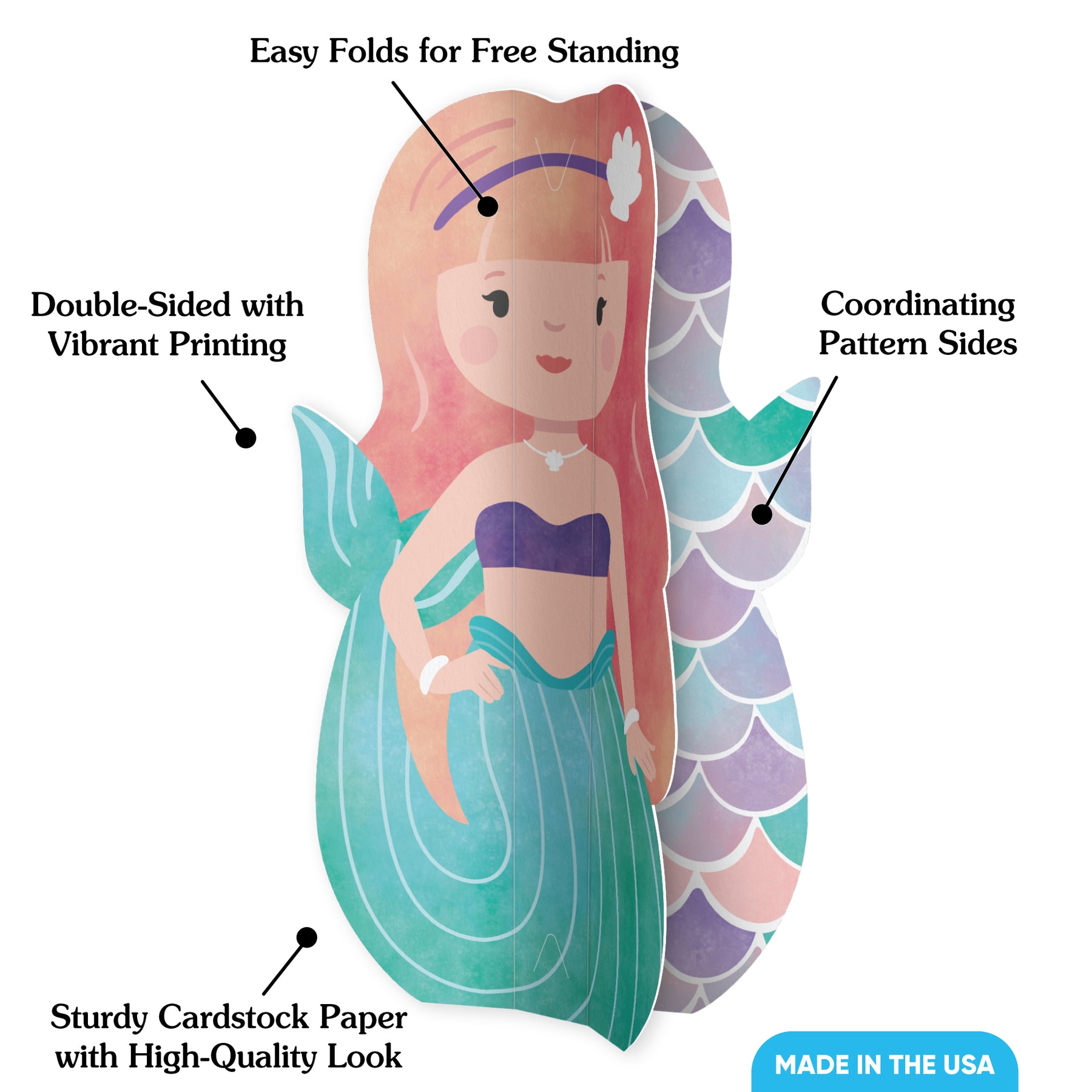 Celebrate baby showers, first birthdays, or under the sea-themed parties with this set of 8 Mermaid 3D Table Centerpieces! Designed to match our Mermaid birthday party theme, these freestanding centerpieces feature an adorable mermaid shape with coordinating patterned sides. Perfect for dining tables, dessert displays, and gift tables, they add a sweet touch to a birthday party or a cozy celebration. Made from sturdy cardstock paper with a photo-like shine, these double-sided centerpieces are easy to assemble and stand tall to make a statement at your event. Proudly made in the Midwest!