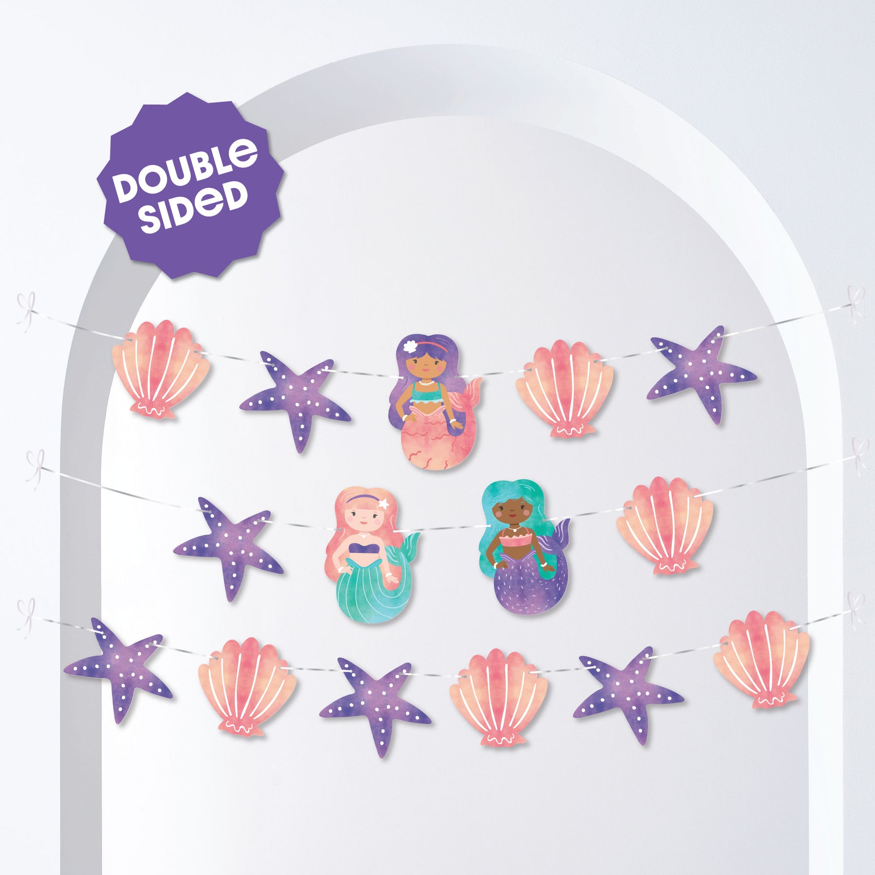 Make a splash with our under-the-sea mermaid garland banner! This magical decoration brings oceanic charm to your celebration, whether you're hosting a mermaid birthday bash or a seaside soirée. Designed for double-sided shimmer, it looks stunning from every angle and comes with 15 feet of white cording for easy setup. Dive in and let the party begin!