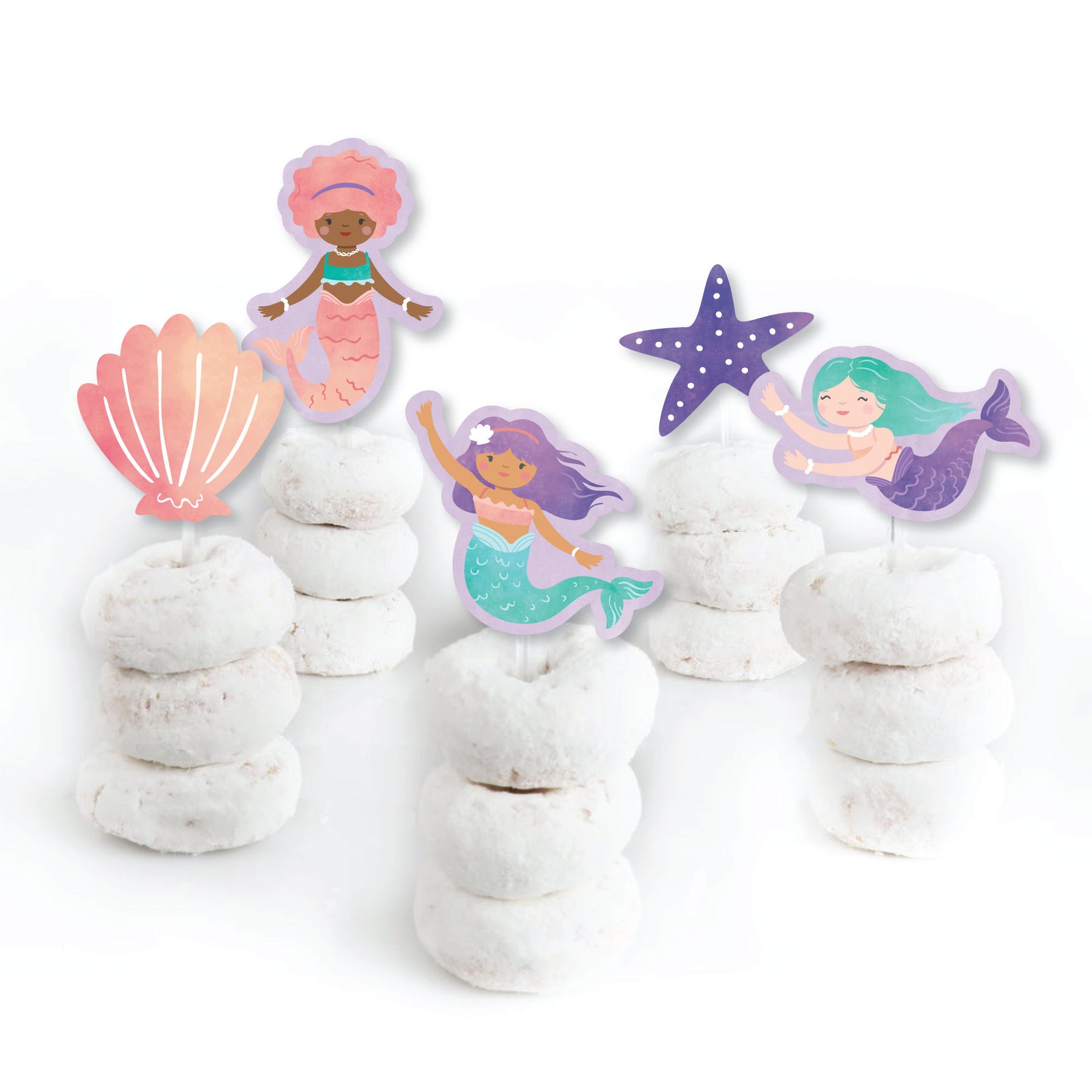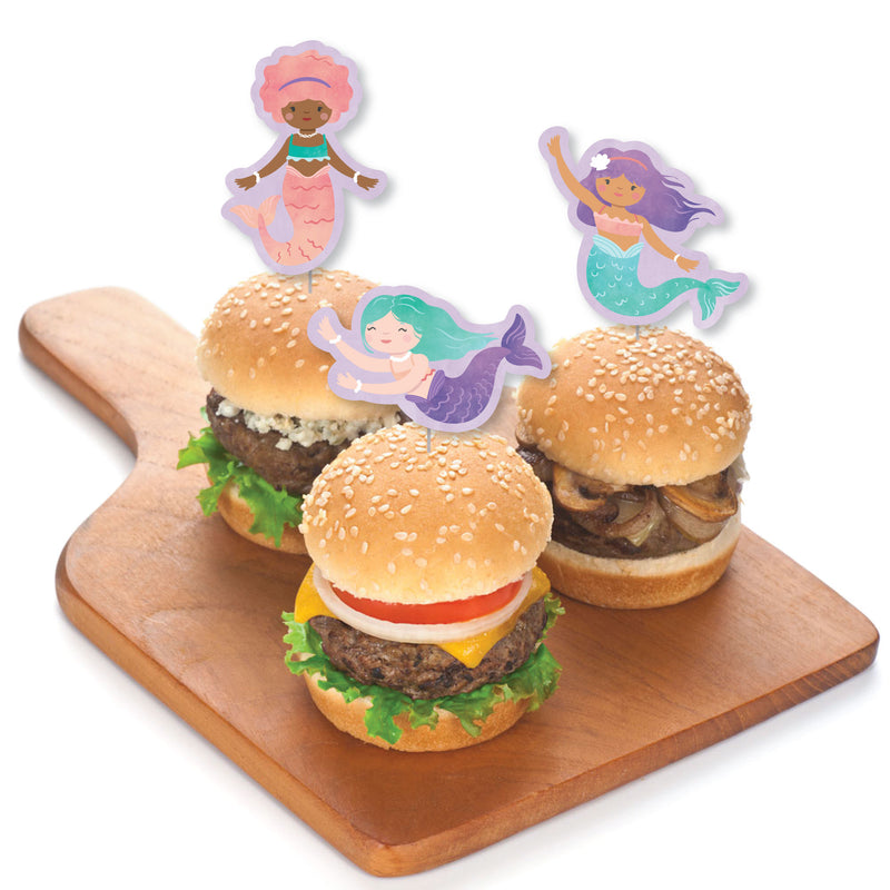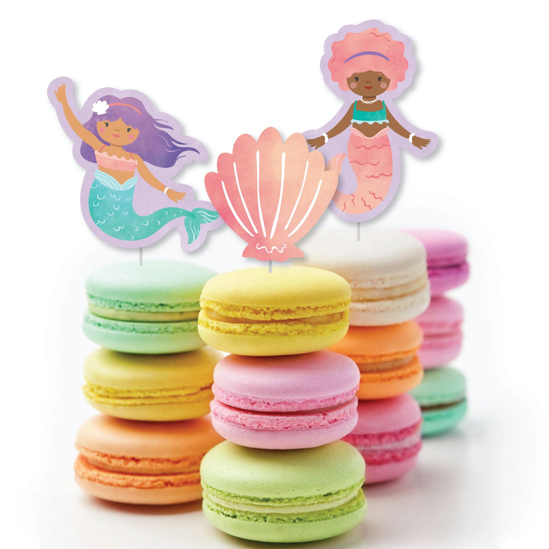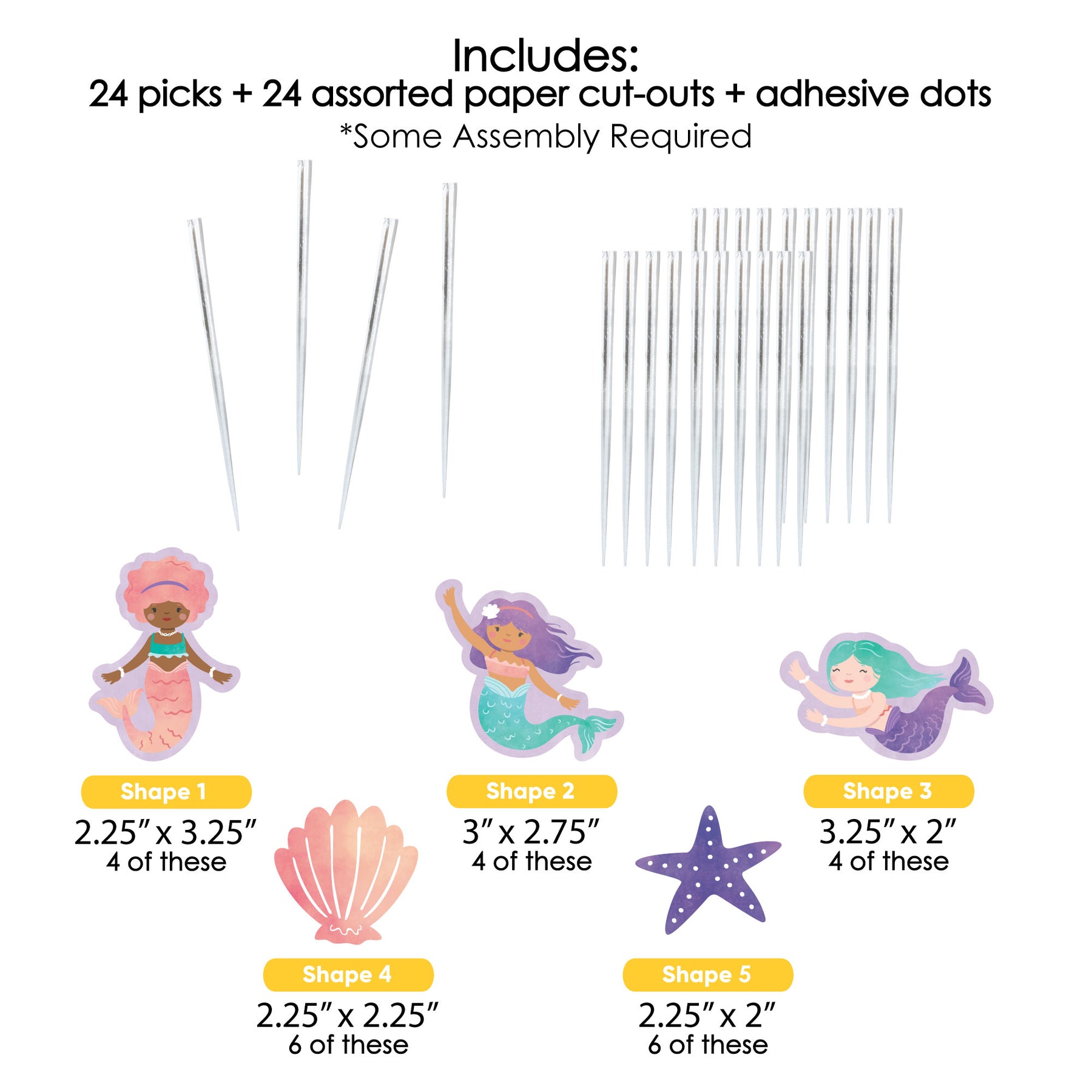 Create a unique dessert bar at your Party with Mermaid Cupcake Toppers. This do-it-yourself kit includes clear treat picks and fun-shaped sea themed cut-outs. Simply attach each double-sided paper cut out to a clear plastic pick with the included clear stickers. Dessert Cupcake Toppers look great on standard cupcakes or add them to other baked goodies such as brownies or donuts. Other appetizers and miniature fruit kabobs are also easy to make with these fun food picks.