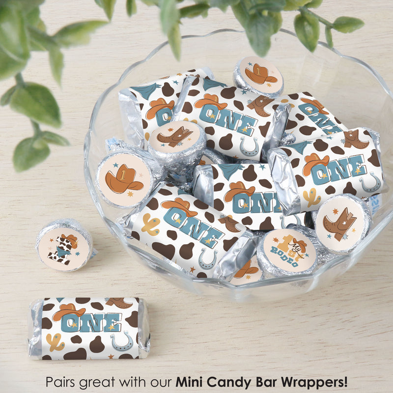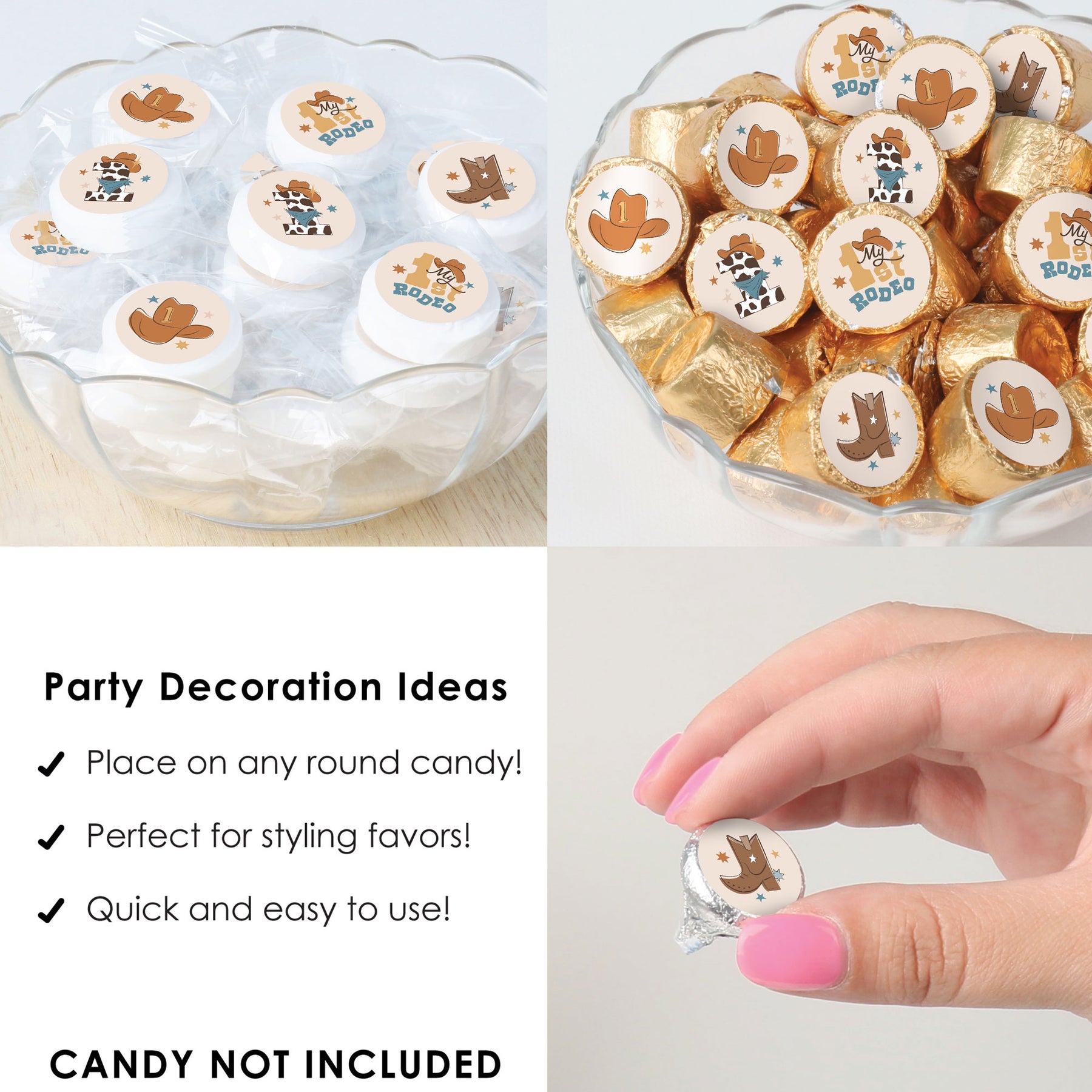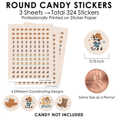 Make your treats a little more special when you adorn them with the My First Rodeo round candy stickers. These delightful stickers come out to be about .75 inches and help to elevate the attention to detail for your Birthday Party. With 4 coordinating designs and 324 stickers total, using these labels is effortless. Simply peel and stick them onto your favorite round bite-sized candies like wrapped chocolates and mints. Use the stickered candies as decoration on your fabulous table setup or give them out to guests as party favors. Consider using the stickers on bottled beverages or party stationery. The creativity is endless!