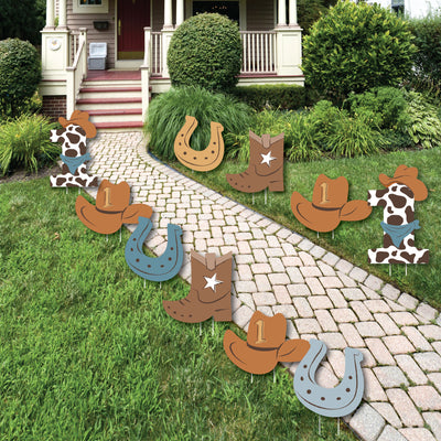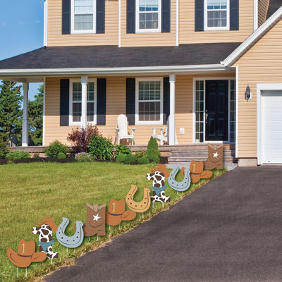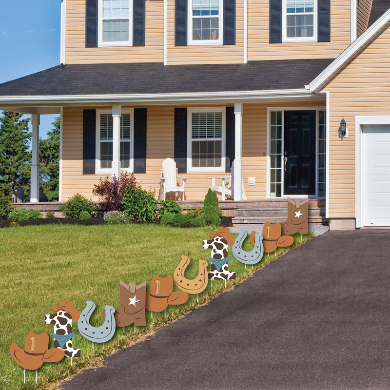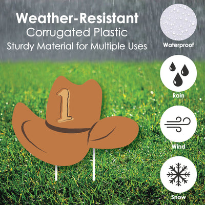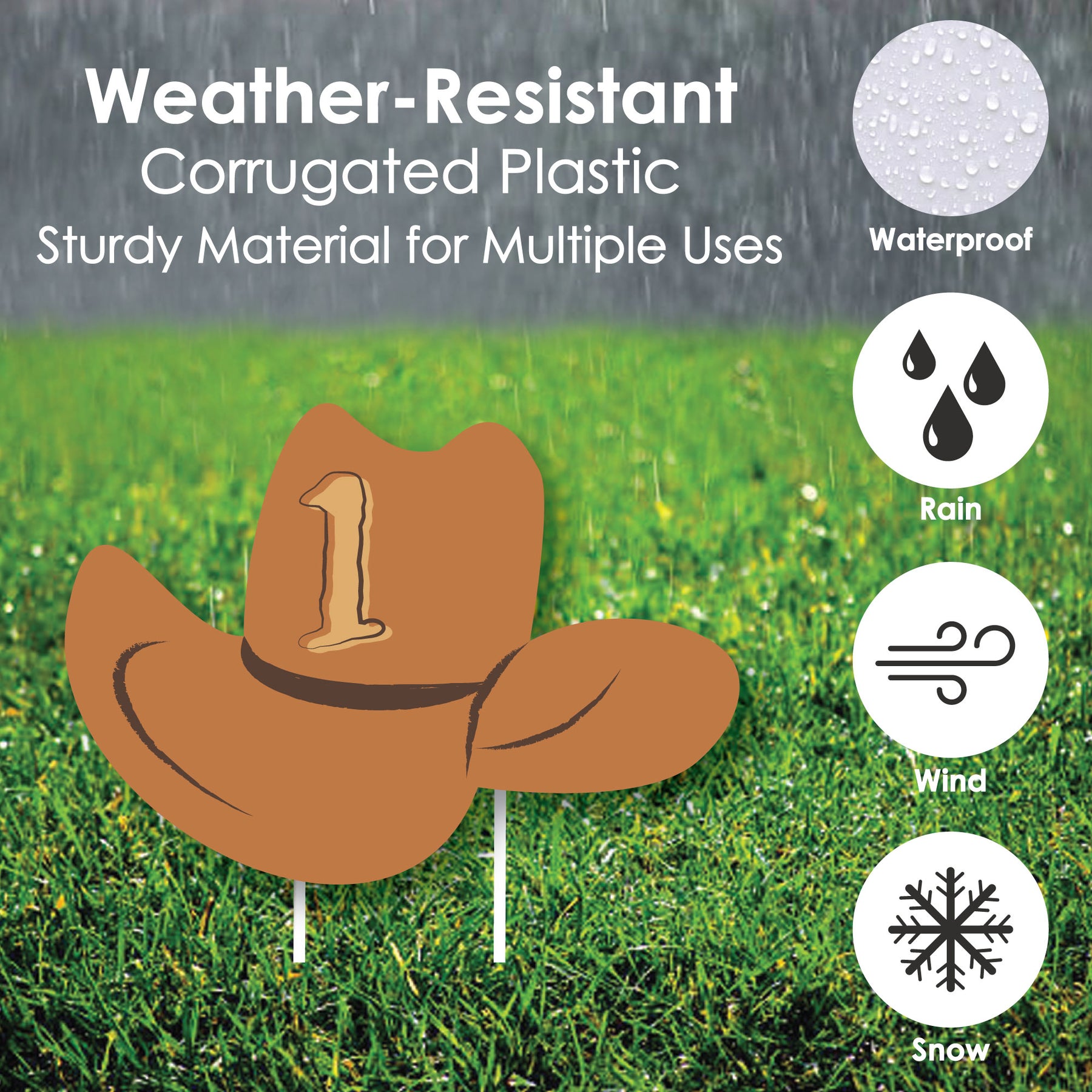 An impressive My First Rodeo yard sign is sure to delight your guests and surprise everyone. This 10-piece set of Western Birthday Party lawn decorations is professionally printed and will make a statement wherever it is used. Each shaped outdoor sign comes with two stakes, making it easy to display on lawns, driveways or courtyards. Best of all, our signs are cut separately so you can arrange them any way you please. These lawn decorations are made of waterproof plastic and is weather resistant, perfect for short-term display but can be used again and again with proper care.