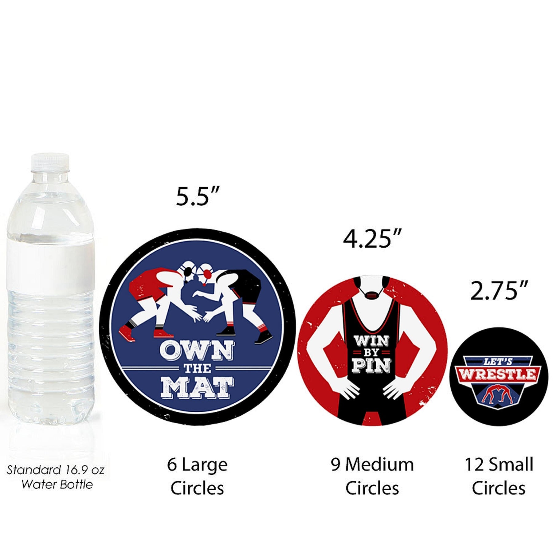 This Kit Includes 27 Confetti Pieces: 6 – 5.5” party circles with Own The Mat - Wrestling Art 9 – 4.25” party circles with Own The Mat - Wrestling Art 12 – 2.75” party circles with Own The Mat - Wrestling Art