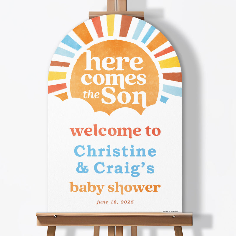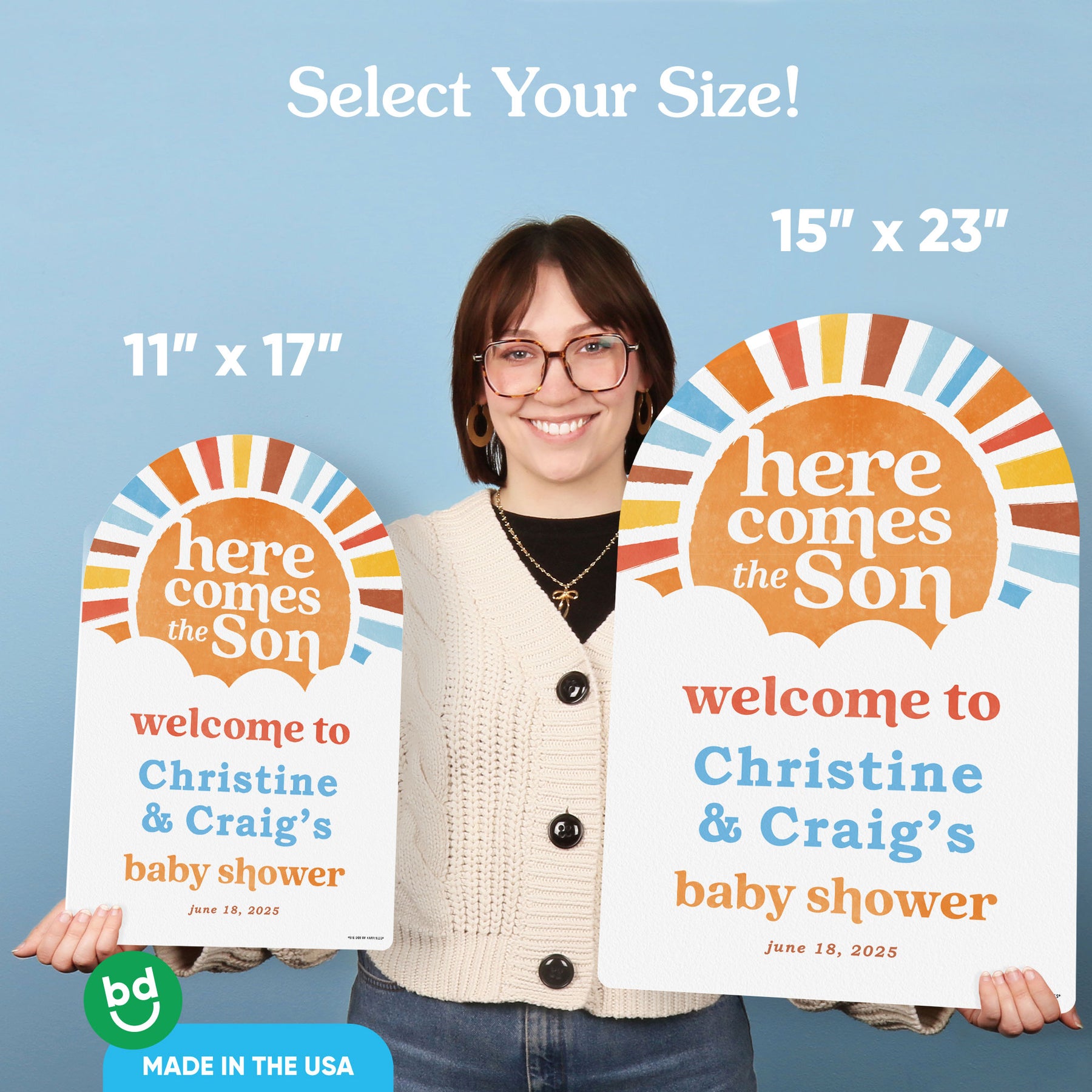 Create an unforgettable baby shower with our Personalized Welcome Sign. This charming party decoration features three customizable text lines and is available in two sizes—11x17 inches or 15x23 inches—to fit your space perfectly. Printed one-sided on a premium matte plastic board with a clean white back, this sign is designed to match a retro sunshine baby shower theme. Display it at the entrance, on the gift table, or as a cute photo backdrop. Proudly made in the Midwest, this keepsake-worthy sign adds a special touch to your Here Comes The Son baby shower.