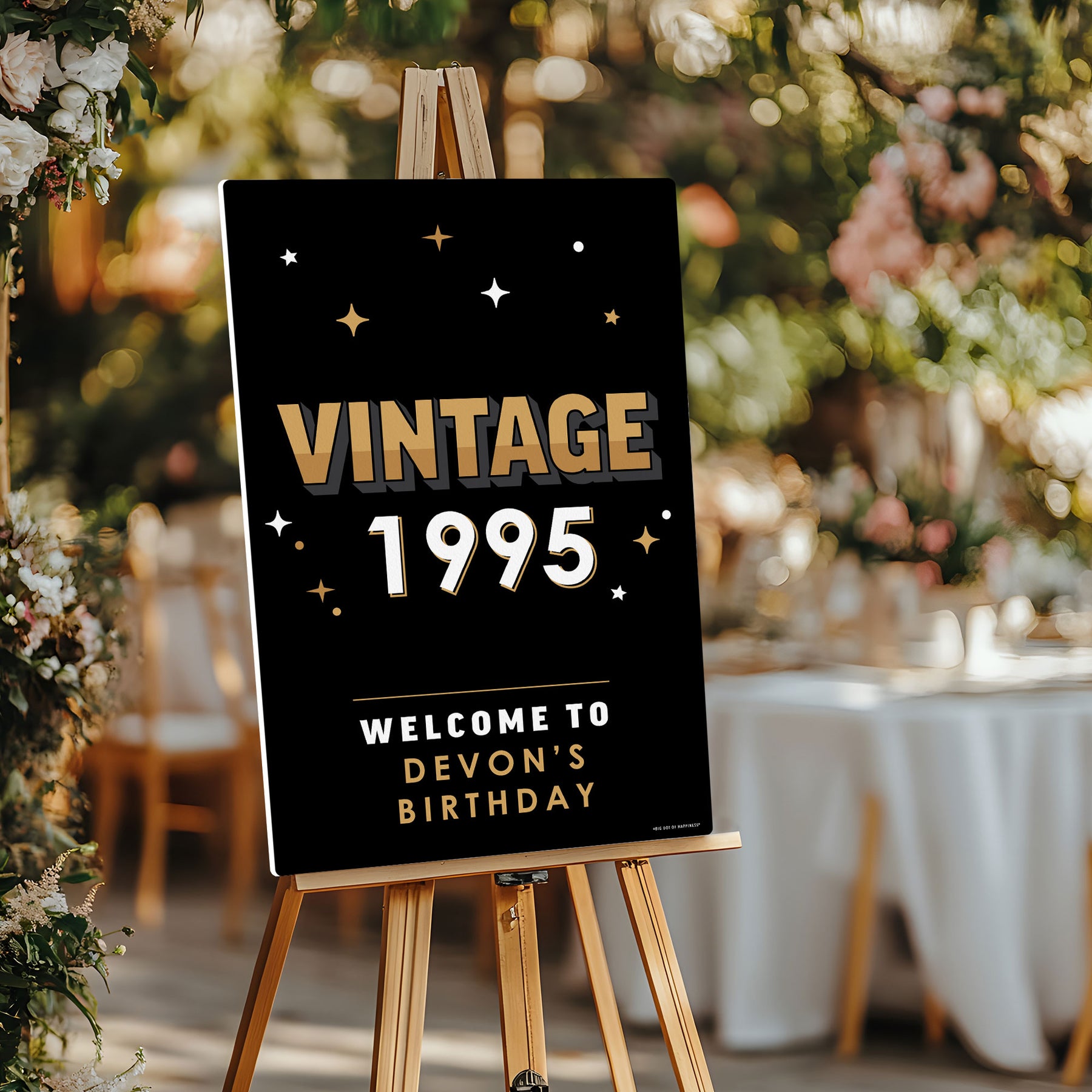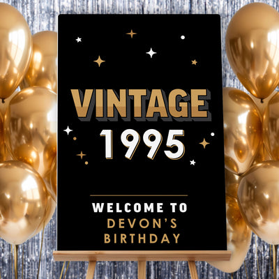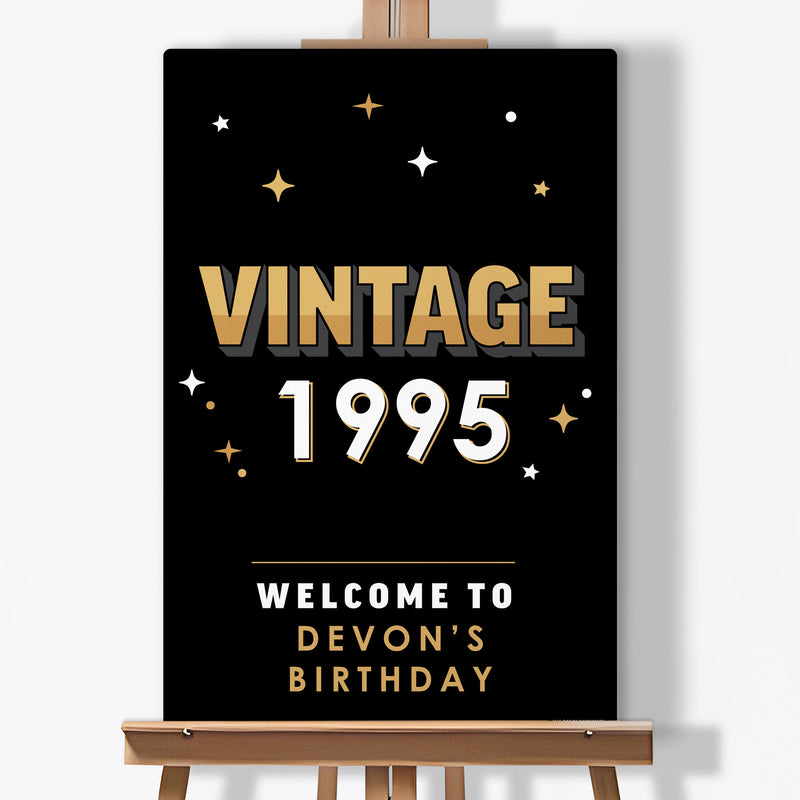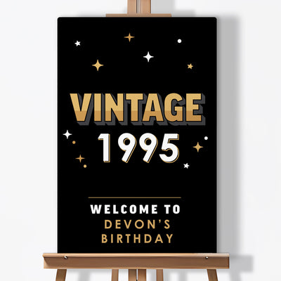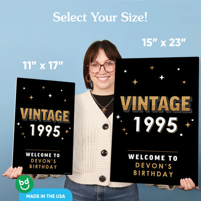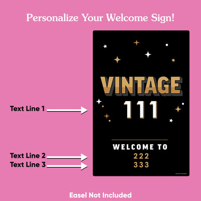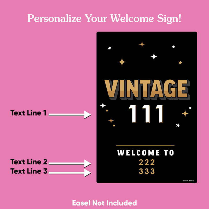 Make the vintage birthday celebration unforgettable with a Personalized Birthday Welcome Sign! Designed to complement a black & gold party theme, this sign features three customizable text lines and is available in two sizes—11x17 inches or 15x23 inches—to fit any celebration space.