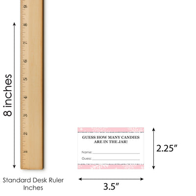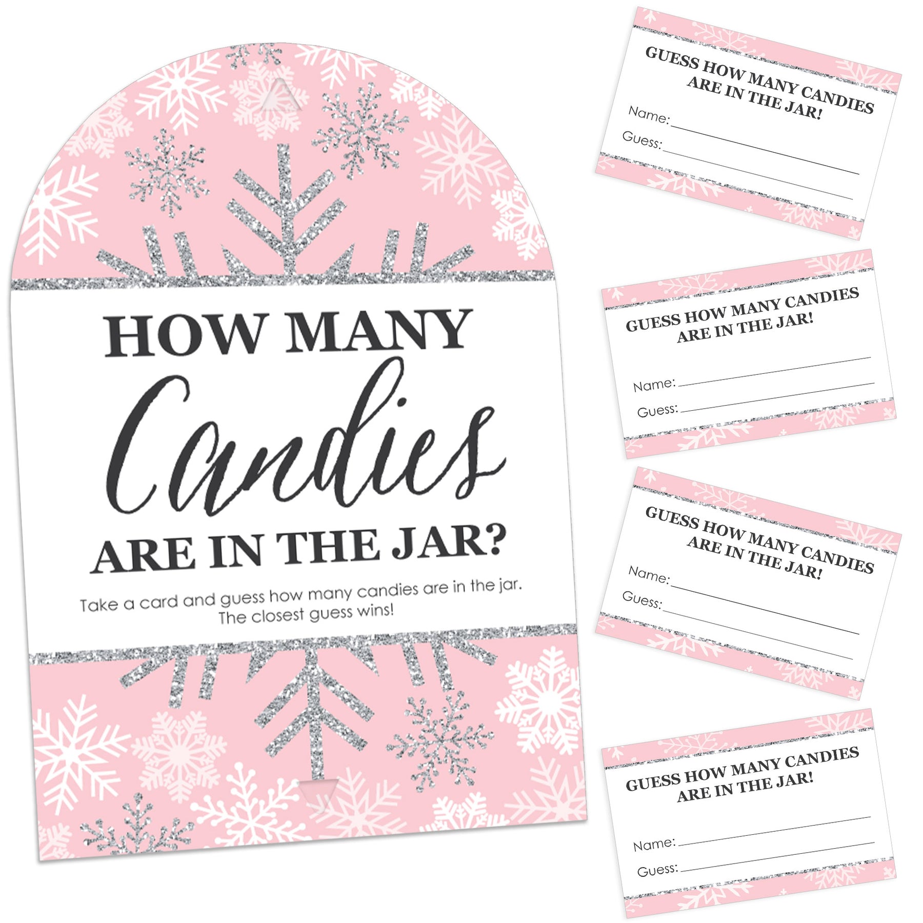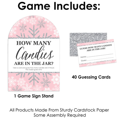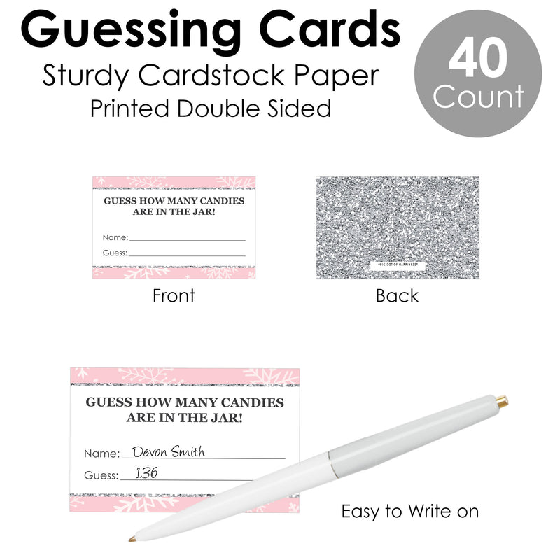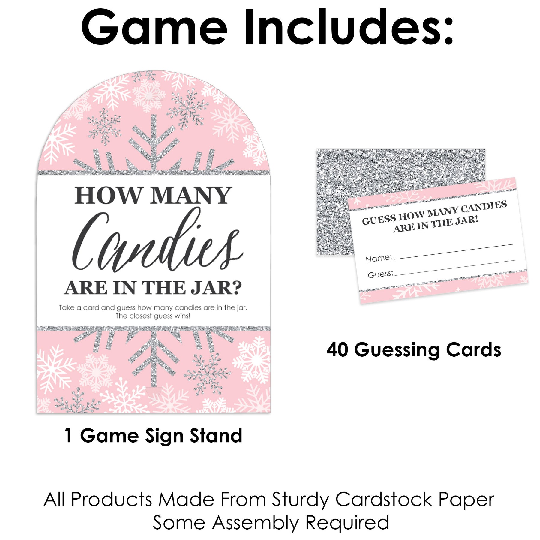 Set up a fun activity at your Holiday Snowflake Birthday Party and Baby Shower with the Pink Winter Wonderland Candy Guessing Game! A classic party game that can be enjoyed by all ages, the Pink Winter Wonderland game comes with 1 sign with stand and 40 guessing cards that are professionally printed on sturdy cardstock paper. To play, first, assemble the sign by folding the sides of the stand toward the center, and then fold the support piece of the stand down until it rests in the notches. Then grab a jar and fill it with bite-sized candies of your choosing. Place the Pink Winter Wonderland sign and cards next to the candy jar and have your guests fill out a card to include their name and guess. Whoever guests the exact amount or closest amount wins! As a bonus, the winner can keep the jar of candy as a prize! Pink Winter Wonderland Candy Guessing Game will be a surefire way to add some excitement to your celebration.