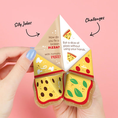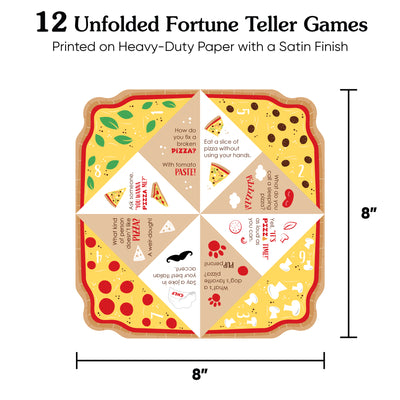 Break the ice and get in on the fun with our Pizza Party Time Fortune Tellers. This set of 12 origami cootie catchers is a must-have favor that will add some fun to your celebration. Professionally printed and cut on heavy-duty paper with a satin finish, each fortune teller will arrive flat with some easy folding assembly required. Simply follow the instructions included on the packaging and then let the good times roll! Each fortune teller features vibrant colors and eye-catching illustrations with Silly Jokes & Challenges on the inside. Players will have a blast shuffling and flipping through each message. Packed with playfulness and personality, the paper cootie catchers are an awesome activity that all ages can enjoy. Bring the excitement with our Fortune Tellers.