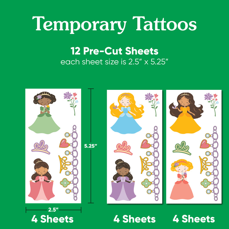 Dive into royal fun with our Princess Temporary Tattoos! This set includes 12 pre-cut sheets of stunning princess designs, perfect for kids who love fairytales. These colorful tattoos make great party favors or a fun tattoo station at your celebration.