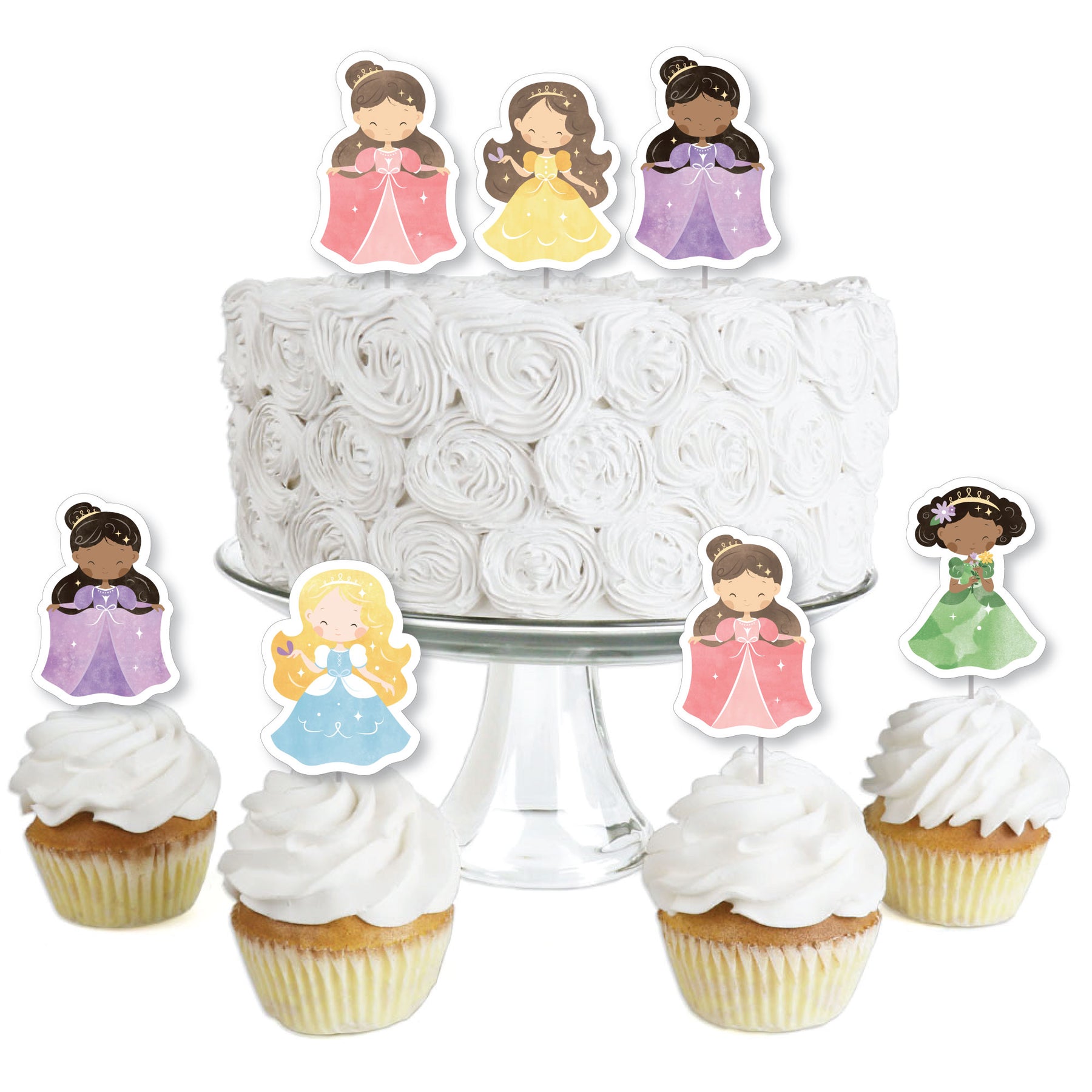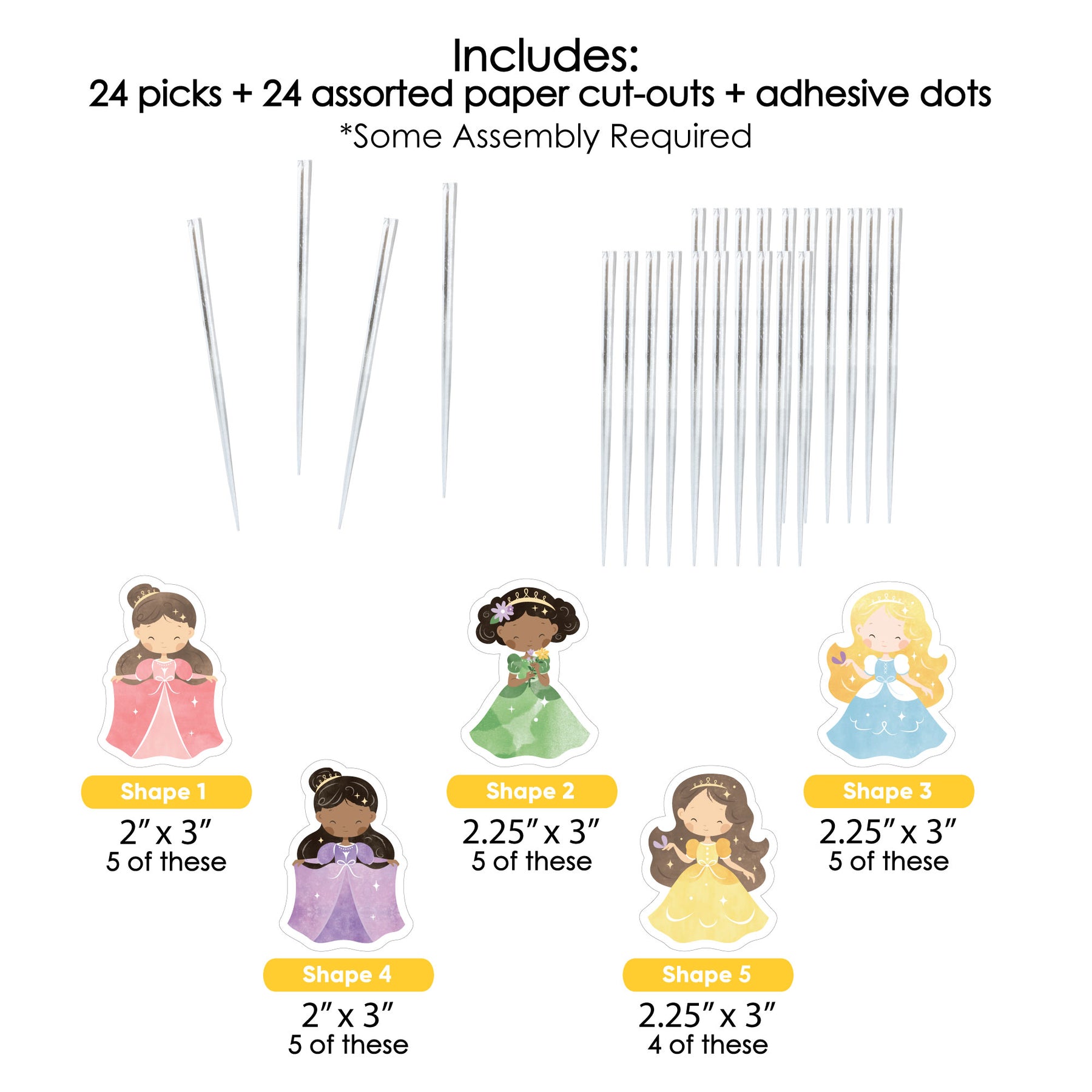 Create a unique dessert bar at your Party with Princess Cupcake Toppers. This do-it-yourself kit includes clear treat picks and princess-shaped cut-outs. Simply attach each double-sided paper cut out to a clear plastic pick with the included clear stickers. Dessert Cupcake Toppers look great on standard cupcakes or add them to other baked goodies such as brownies or donuts. Other appetizers and miniature fruit kabobs are also easy to make with these fun food picks.
