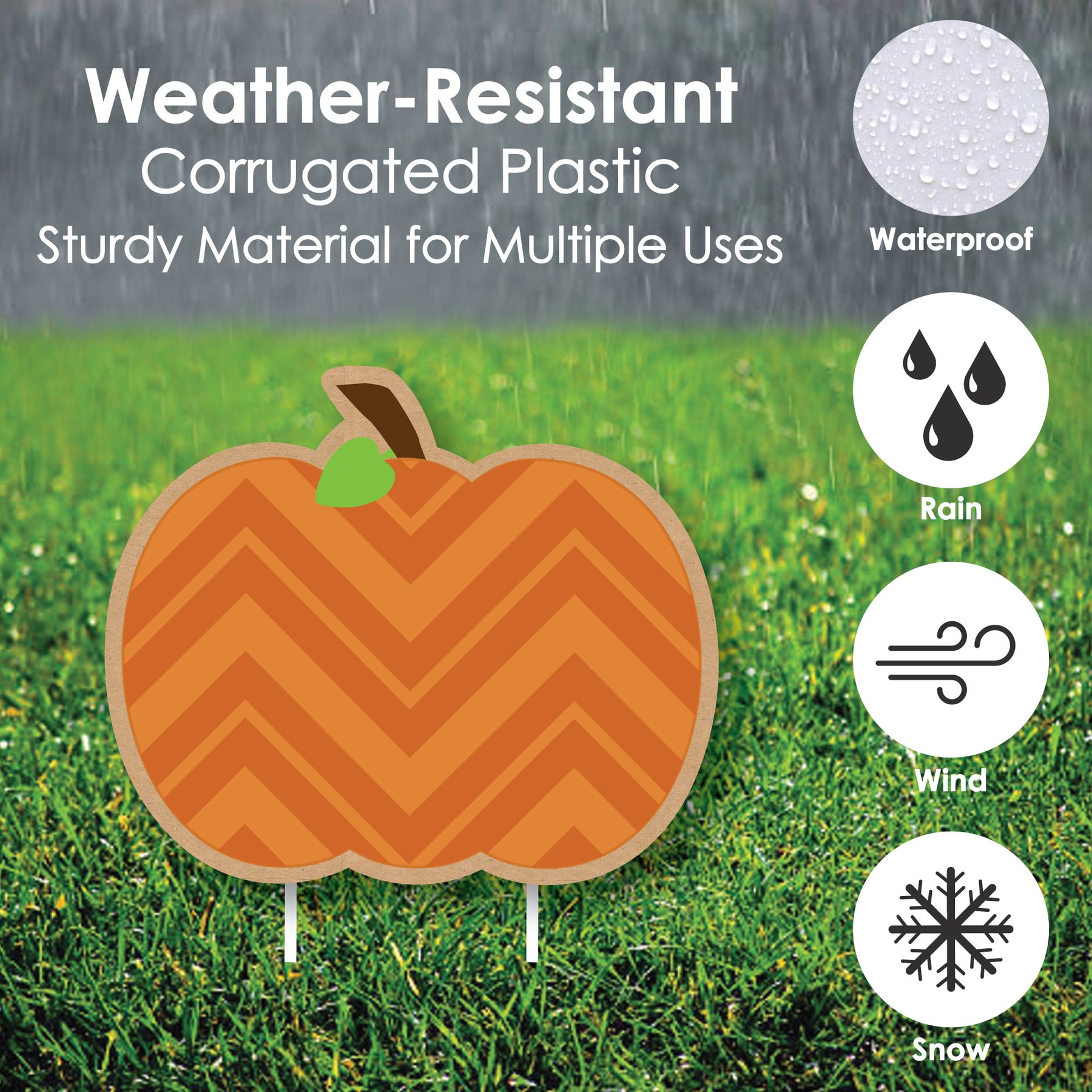 An impressive Pumpkin Patch yard sign is sure to delight your guests and surprise everyone. This 8-piece set of Fall & Thanksgiving lawn decorations is professionally printed with vivid colors to really make a statement wherever it is used. Each outdoor shape comes with two stakes, making it easy to display on lawns, driveways or courtyards. Best of all, Pumpkin Patch shapes are cut separately so you can arrange them any way you please. These decorative yard signs are made of waterproof plastic and are weather resistant, perfect for short-term display but can be used again and again with proper care.