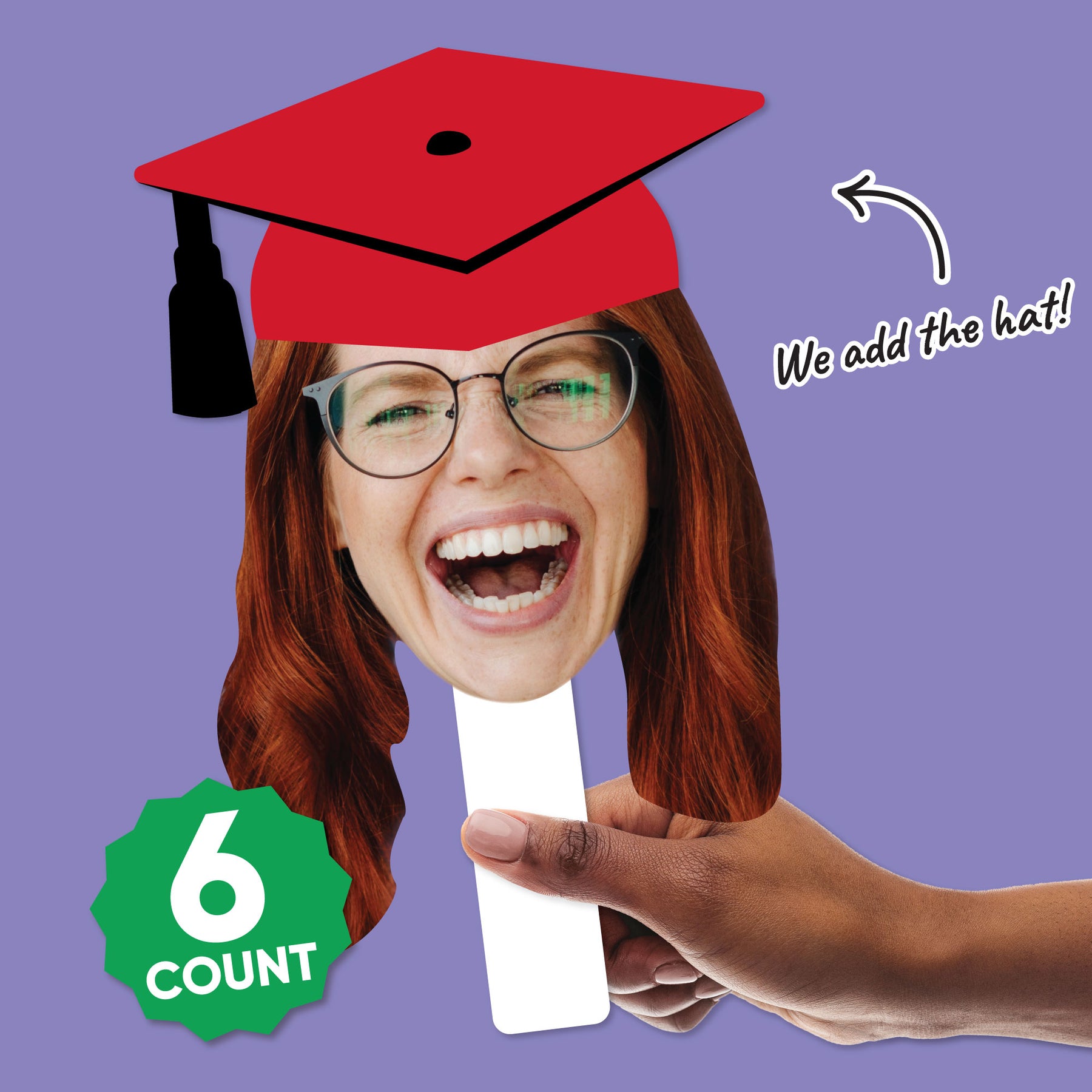 Celebrate your special someone with this set of 6 matching Graduation Fun Face Cutout Paddles. These fun and unique Graduation Party accessories will feature ONE custom photo face cut-out with 1 graduation hat design and will be a hilarious addition to your celebration. Capture silly snapshots when you use them as photo booth props or keep yourself cool when you use one as a handheld fan. Create memories of a lifetime when you use the personalized graduation party decorations at your celebration!