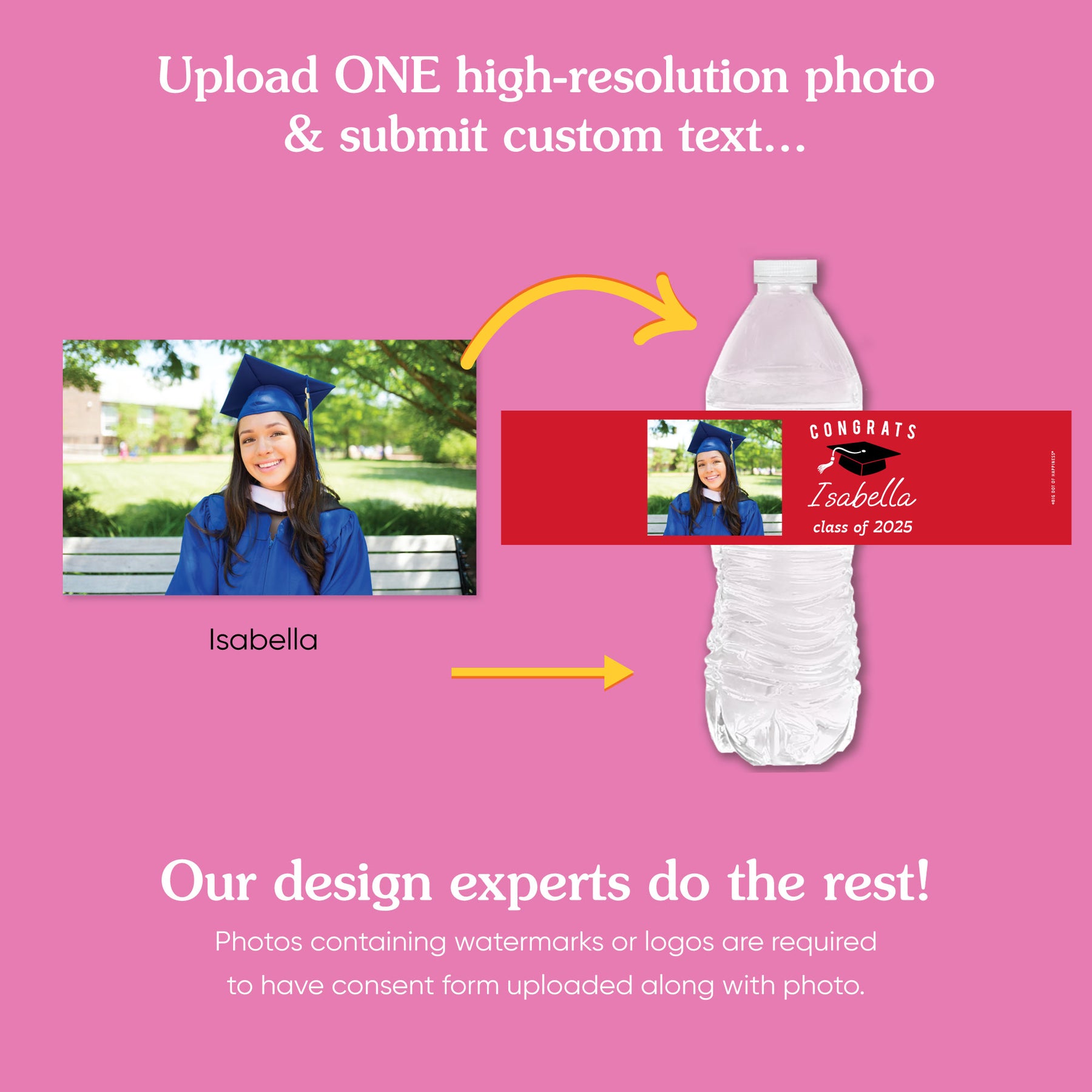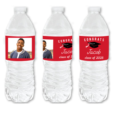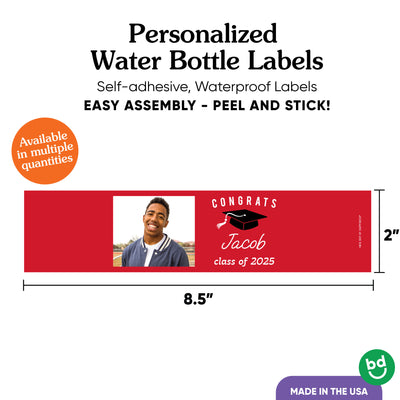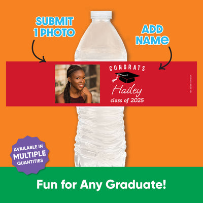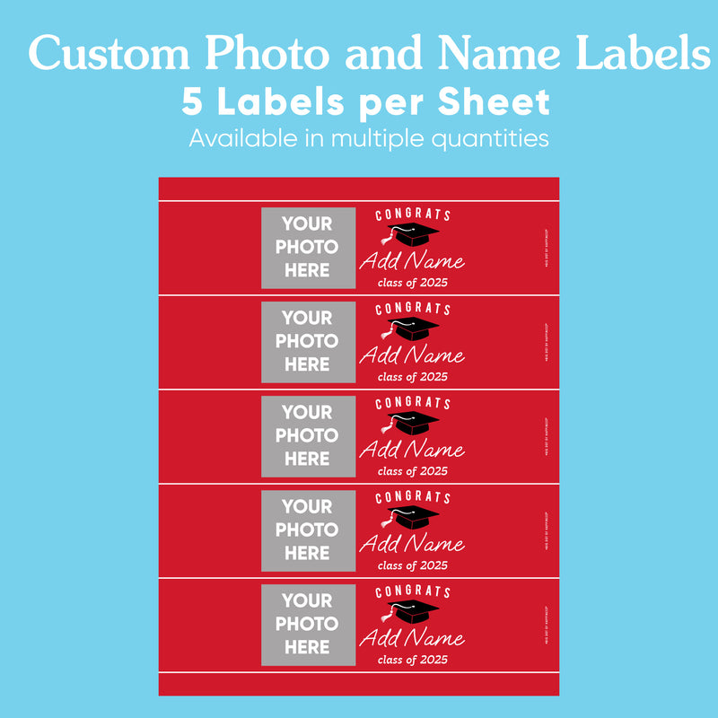 Hosting a red-themed grad party? Add a personal touch with our Personalized Graduation Water Bottle Labels! Upload a favorite photo and include the grad’s name to create custom bottle wraps that are perfect for a red class of 2026 celebration. These waterproof labels stay vibrant even in ice buckets and are easy to apply – just peel and stick! Use them beyond bottles by adding them to party favors, gift bags, or jars. Available in sets of 20, 50, or 100 labels, they’re a fun way to make your event feel extra special. Proudly made in the Midwest!